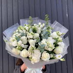 White rose - 15 pcs carnation white - 5 pcs wrapping paper - 6 pcs eucalyptus leaves - 5 pcs lisanthus white - 8 pcs