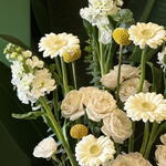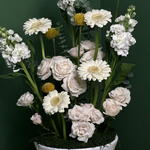Eucalyptus - 3 pcs Spray rose - 3 pcs Gerbera - 5 pcs matthiola - 3 pcs craspedia - 4 pcs ceramic vase - 1 pcs