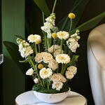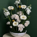 A serene and elegant floral arrangement crafted with soft ivory roses, creamy gerbera daisies, and delicate white stock flowers, accented with playful yellow billy balls for a modern touch. Set in a sleek white bowl with lush green moss, this design brings a gentle balance of sophistication and freshness. Perfect for home décor, office spaces, or gifting someone who loves minimal, natural beauty with a luxurious feel.
