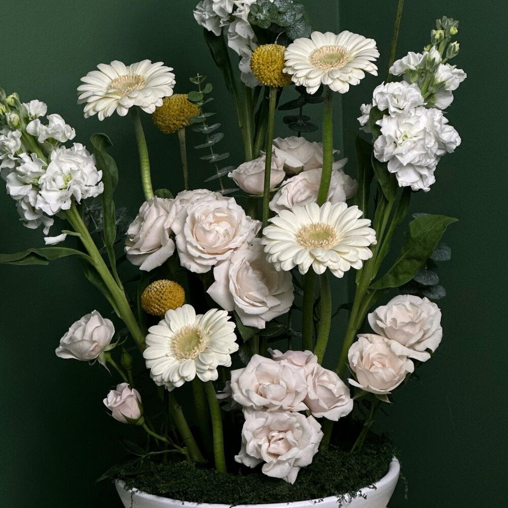A serene and elegant floral arrangement crafted with soft ivory roses, creamy gerbera daisies, and delicate white stock flowers, accented with playful yellow billy balls for a modern touch. Set in a sleek white bowl with lush green moss, this design brings a gentle balance of sophistication and freshness. Perfect for home décor, office spaces, or gifting someone who loves minimal, natural beauty with a luxurious feel.