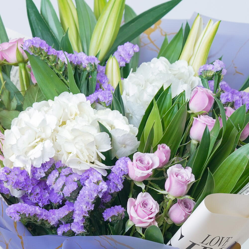 white hydrangea - 2 pcs white oriental lilies - 2 pcs purple statice stems - 3 pcs purple baby roses - 5 pcs song of jamaica stems - 2 pcs