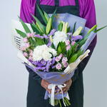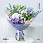 2 White Oriental Lilies 2 White Hydrangea 5 Purple Baby Roses 3 Stems Purple Statice 2 Stems Song Of Jamaica Wrapped In Silver Marble Paper Finished With Off-White Newspaper Wrap Tied With White Ribbon Dimensions Height – 45 Cm Width – 40 Cm