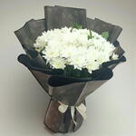 A refined bouquet of pure white chrysanthemums wrapped in elegant charcoal paper—symbolizing peace, honesty, and timeless grace. Perfect for moments of respect, new beginnings, and calm heartfelt expressions.