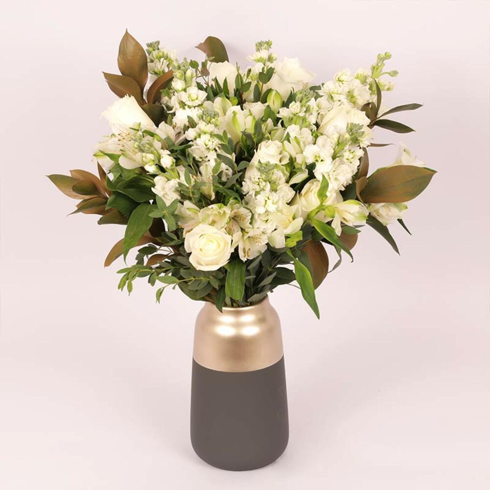 White rose - 7 pcs white alstroemeria - 7 pcs parvifolia - 1 pcs ceramic vase - 1 pcs white matthiola - 9 pcs golden spray ruscus - 5 pcs