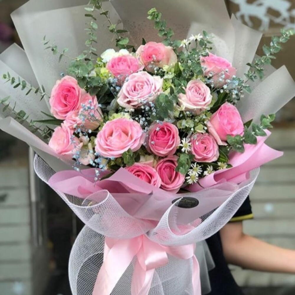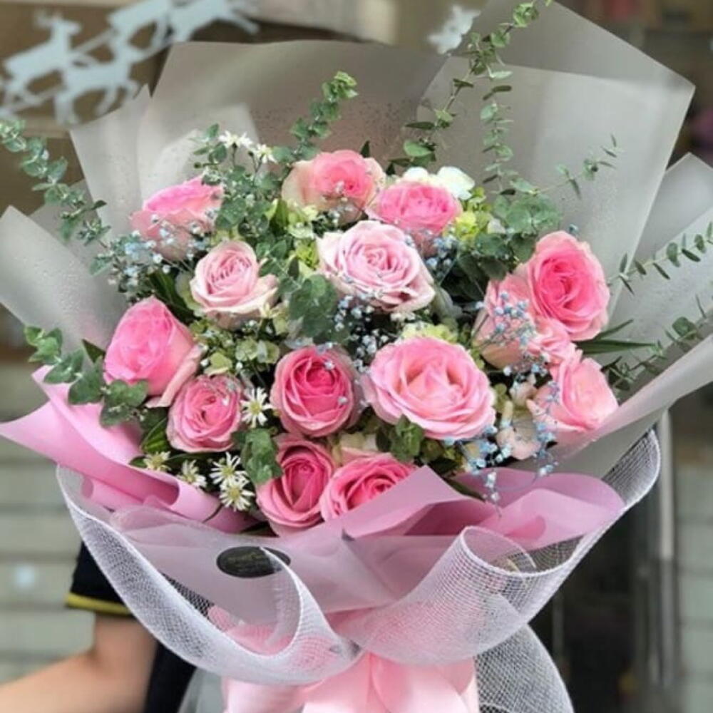 Gypsophila - 2 pcs white lisianthus - 4 pcs wrapping paper - 4 pcs eulcyptus - 4 pcs experience roses - 9 pcs wam pink rose - 10 pcs