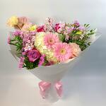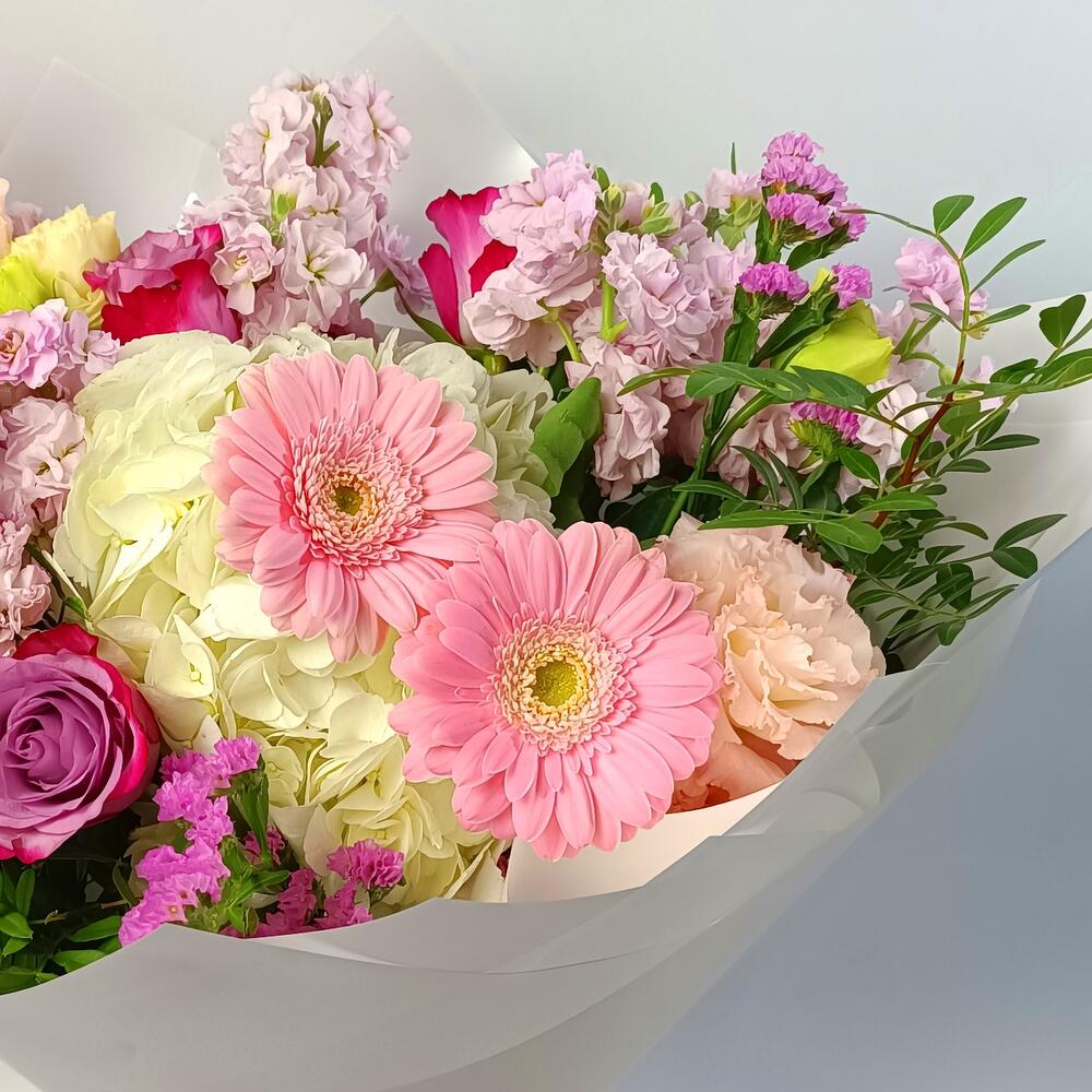 hydrangea white - 1 pcs lisianthus pink - 2 pcs statice pink - 3 pcs deep purple rose - 3 pcs mathiola pink - 3 pcs gerbera pink mini - 2 pcs pestacia leaves - 2 pcs