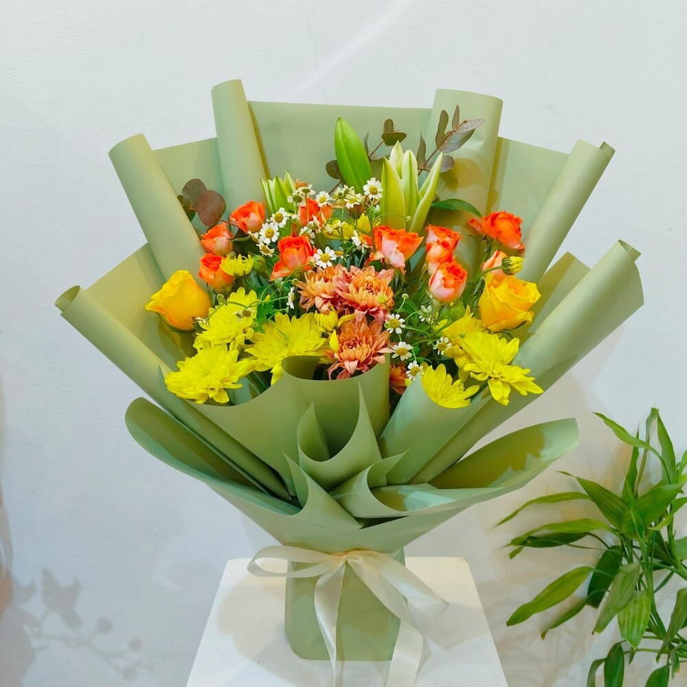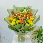 Chrysanthemum - 4 pcs Lilies - 3 pcs daisy - 10 pcs chrysanthemum yellow - 6 pcs baby rose orange - 10 pcs
