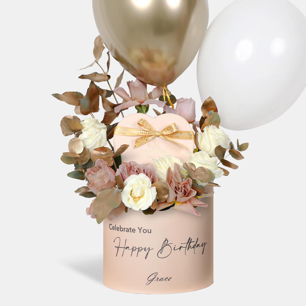 Make their birthday sweeter with a luxurious Birthday Hamper featuring Godiva Chocolate Truffles (7pcs), a Teddy Bear with flowers of Rose Caffe Latte, White Rose, Eucalyptus.