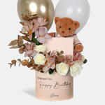 Surprise them with a luxurious Birthday Hamper, including a teddy bear, a box of 12pcs chocolate truffles, Rose Caffee Latte, White Rose, Eucalyptus, and two vibrant balloons.