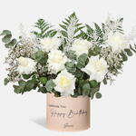 Embrace Snowflakes in a box: white roses, dried Limonium, Leather fern, and eucalyptus create elegance.