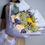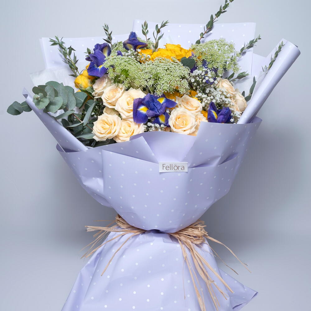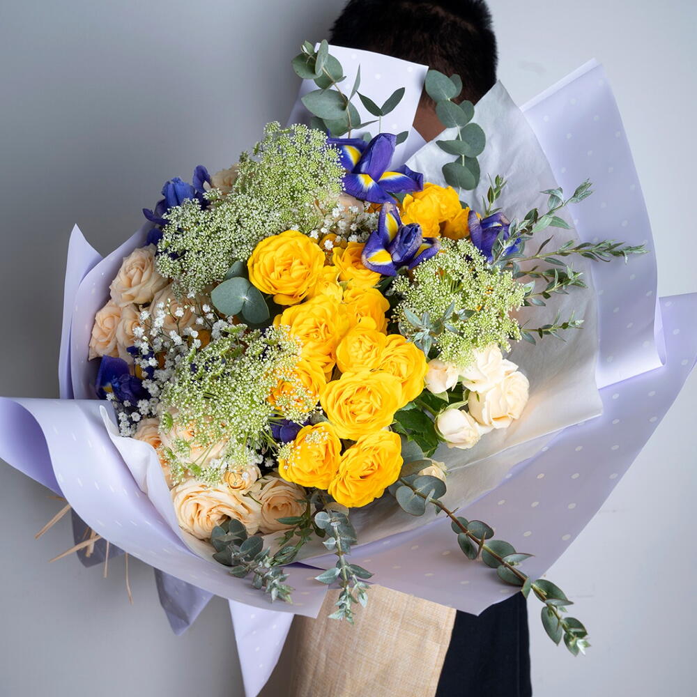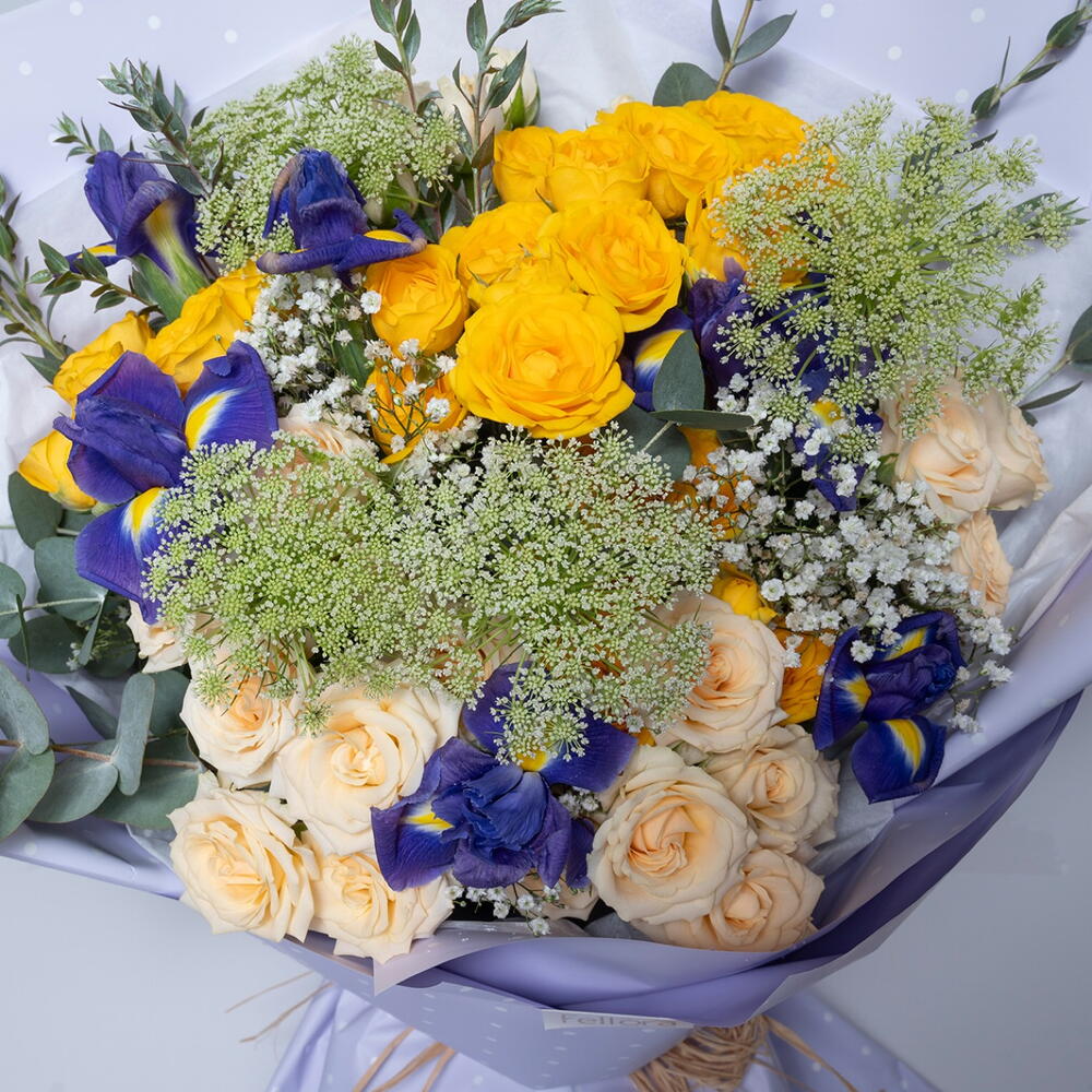 Iris blue - 6 pcs Gypsophila - 3 pcs eucalyptus leaves - 2 pcs yellow baby rose - 4 pcs parvifolia leaves - 2 pcs salinaro baby rose - 4 pcs