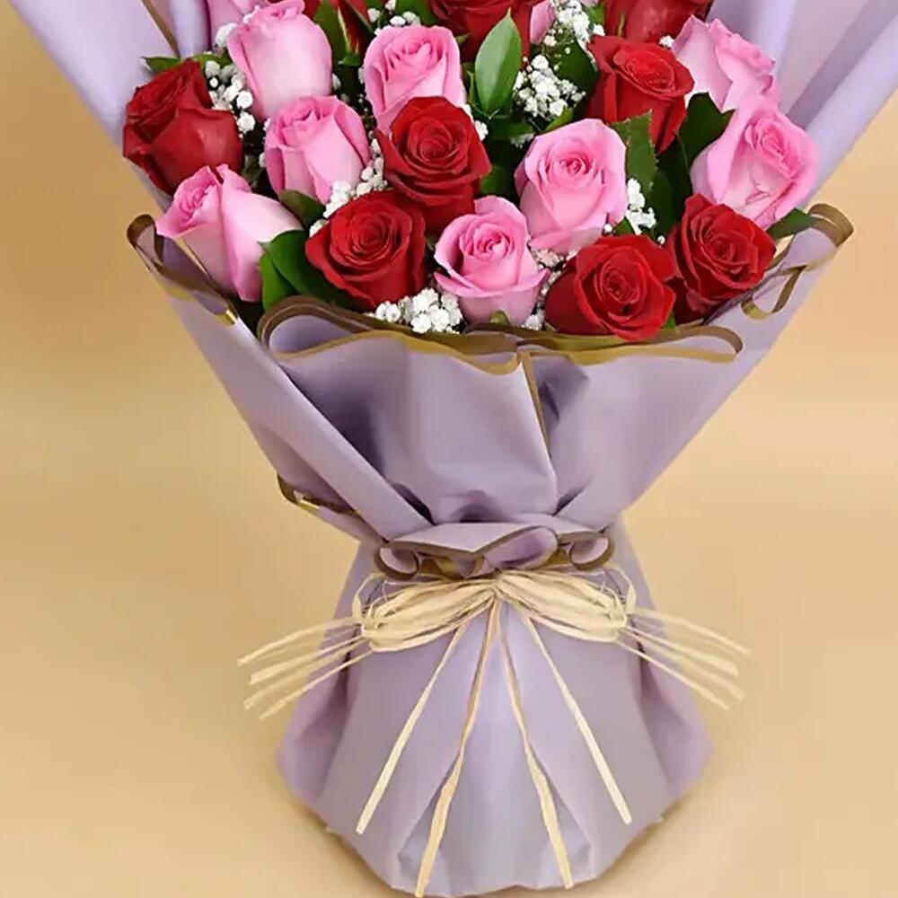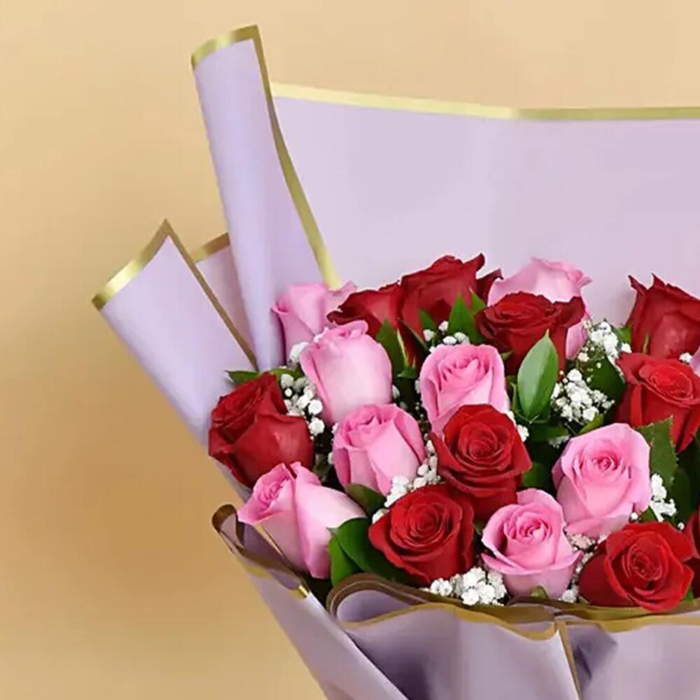 This enchanting Mono Bouquet is a genuine expression of love and adoration, artfully assembled with 11 robust red roses and 10 delicate pink roses. Each flower handpicked to ensure it captures natures beauty at its prime. Every stem sits prettily in an elegant wrapping, tied together with a charming ribbon, creating an alluring floral presentation. Classy and radiant, its the perfect gift to convey heartfelt sentiments, celebrate special moments, or simply to infuse any room with an ocean of colours.