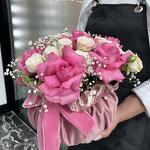 Composition: Rose pink - 7, Rose spray Bombastic - 3, Gypsophila - 2, Velvet pouch bag - 1 Sizes: WIDTH - 20CM; HEIGHT - 25CM; LENGTH - 25CM; (including packaging) Size: 20 x 25 x 25 cm