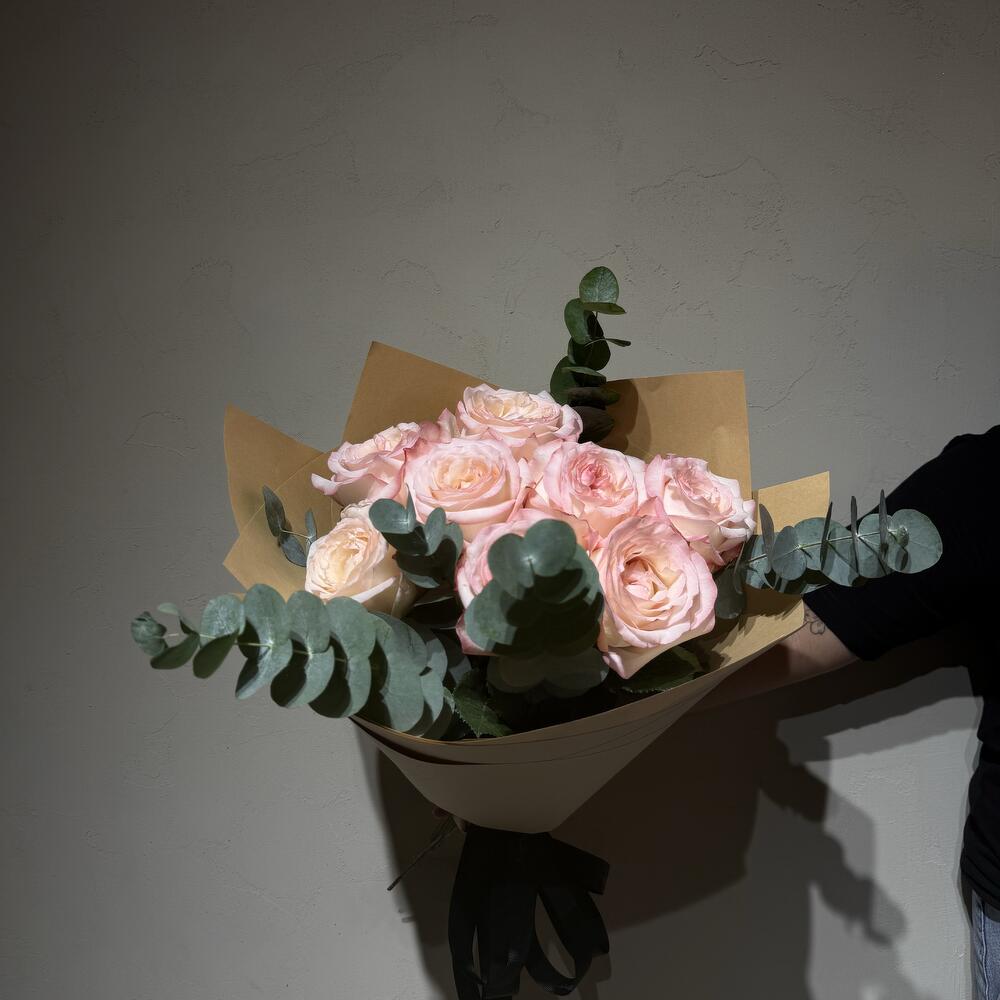 Ribbon - 2 pcs Eucalyptus - 1 pcs wrapping paper - 5 pcs rose julietta - 8 pcs paper bag - 1 pcs
