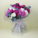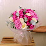 A stunning bouquet featuring Julietta Cerise roses, Ohara white roses, and soft pink hydrangeas, complemented by lush eucalyptus leaves. The rich cerise and delicate white roses blend harmoniously with the soft pink hydrangeas, creating a timeless and romantic arrangement. The fragrant eucalyptus leaves add a touch of elegance and texture. Perfect for any occasion, this bouquet exudes sophistication, charm, and natural beauty, making it an unforgettable gift or centerpiece.