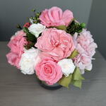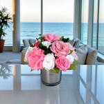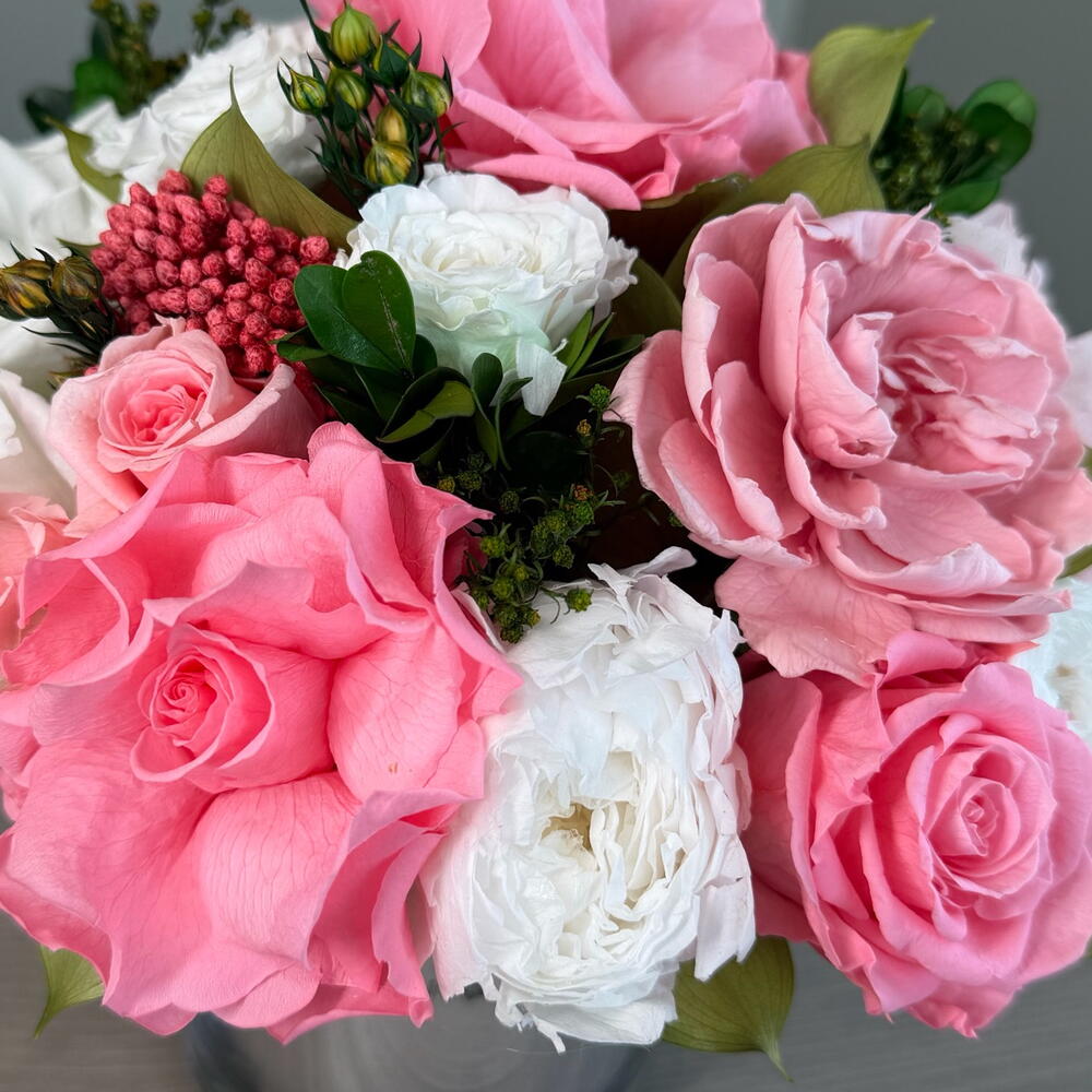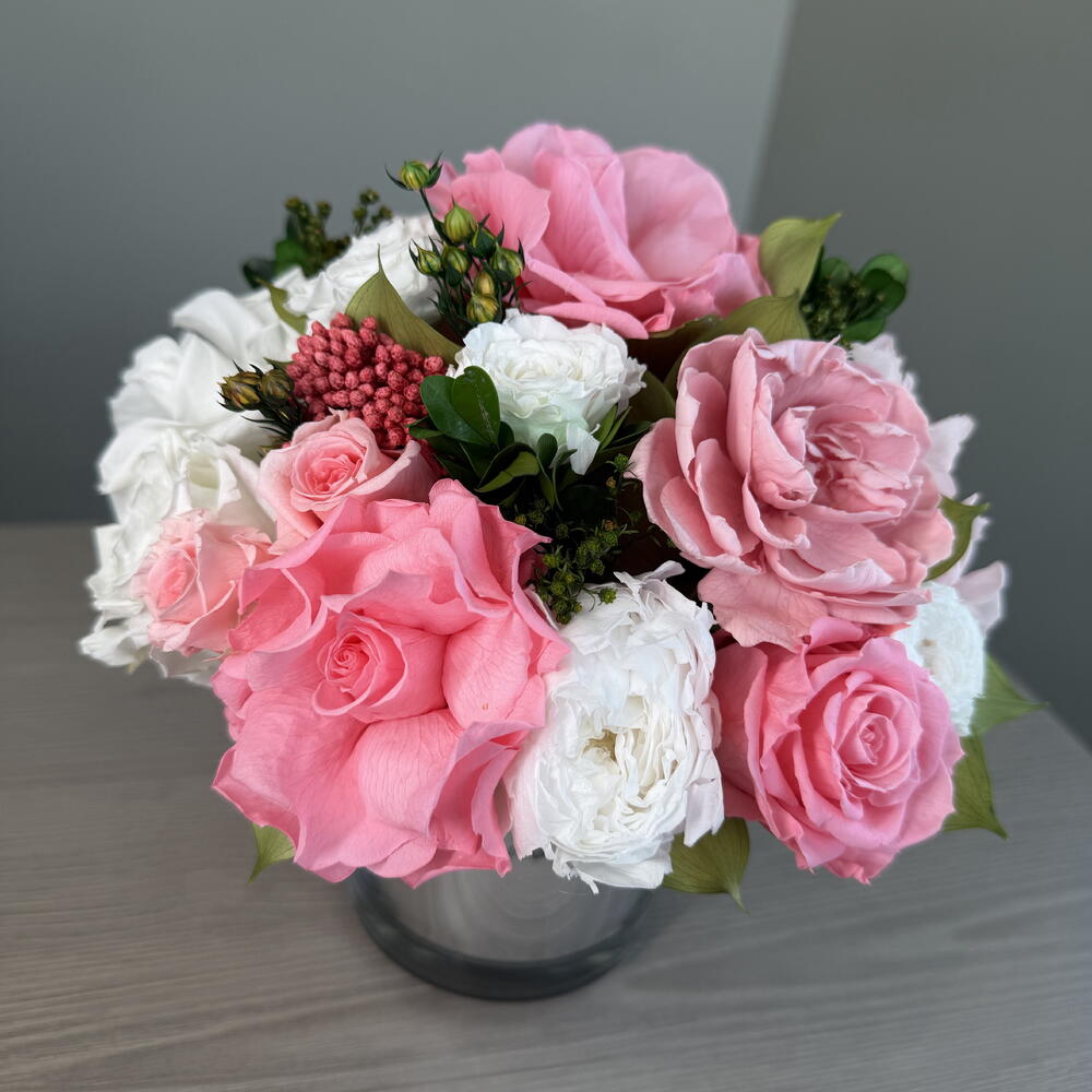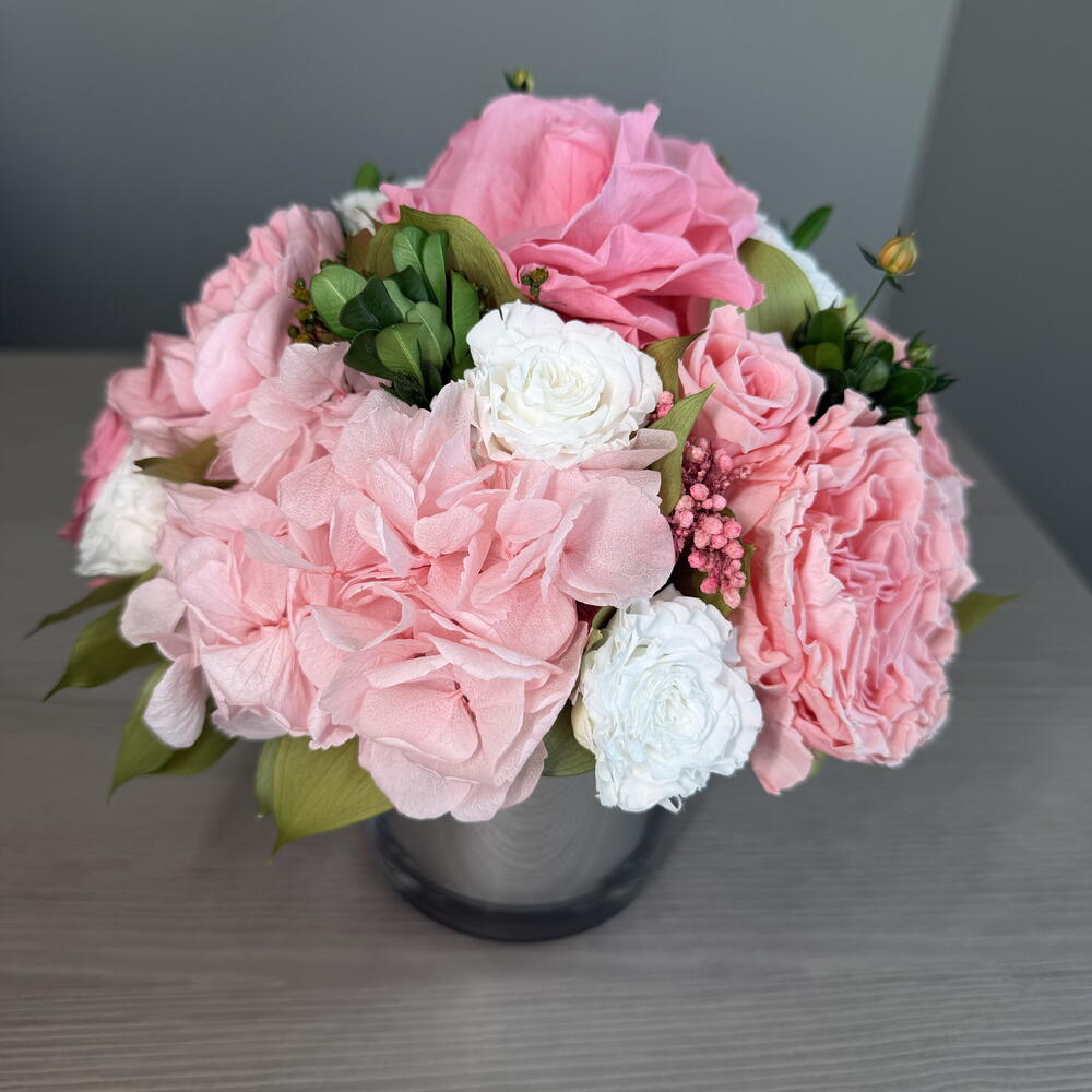 Juliette is small mirror glass vase arrangement featuring Candy Pink and white roses and baby pink hydrangeas and gardenia is bursting with its shape and juicy colors. This piece is crafted exclusively from 100% natural flowers that have been bio-preserved to last up to one year without the need for water or maintenance. Please note that each arrangement is uniquely designed by our in-house florists with love.