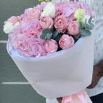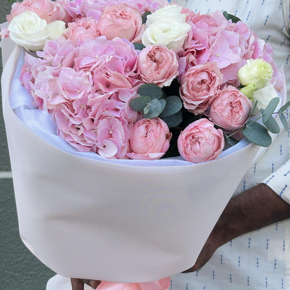 hydrangea pink - 3 pcs julietta - 3 pcs eucalyptus leaves - 3 pcs lisanthus white - 3 pcs