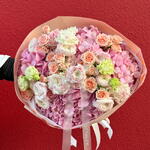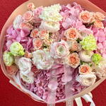 eustoma peach - 7 pcs ranunculus - 8 pcs rose spray juliette - 5 pcs hydrangeas light pink - 5 pcs rose aloer - 8 pcs