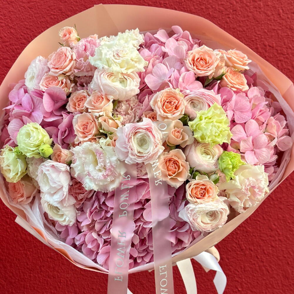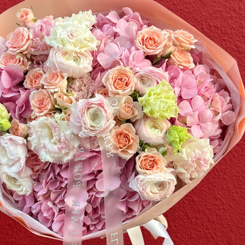 eustoma peach - 7 pcs ranunculus - 8 pcs rose spray juliette - 5 pcs hydrangeas light pink - 5 pcs rose aloer - 8 pcs