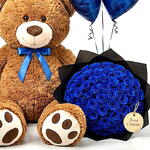 Go big or go home, this show-stopping gift set combines a giant 90 cm plush teddy bear, a striking bouquet of 41 deep blue roses, and 3 metallic heart balloons into one unforgettable delivery. Blue roses symbolise mystery, rarity, and deep admiration, making this the ultimate statement gift for someone truly special. Whats included: Jumbo teddy bear 90 cm tall) · 41 blue roses bouquet · 3 metallic blue heart balloons · Premium gift wrapping · Optional personalised message card Perfect for anniversaries, Valentines Day, birthdays, and grand romantic gestures. Available for same-day and scheduled delivery across Dubai. This is the gift theyll talk about.