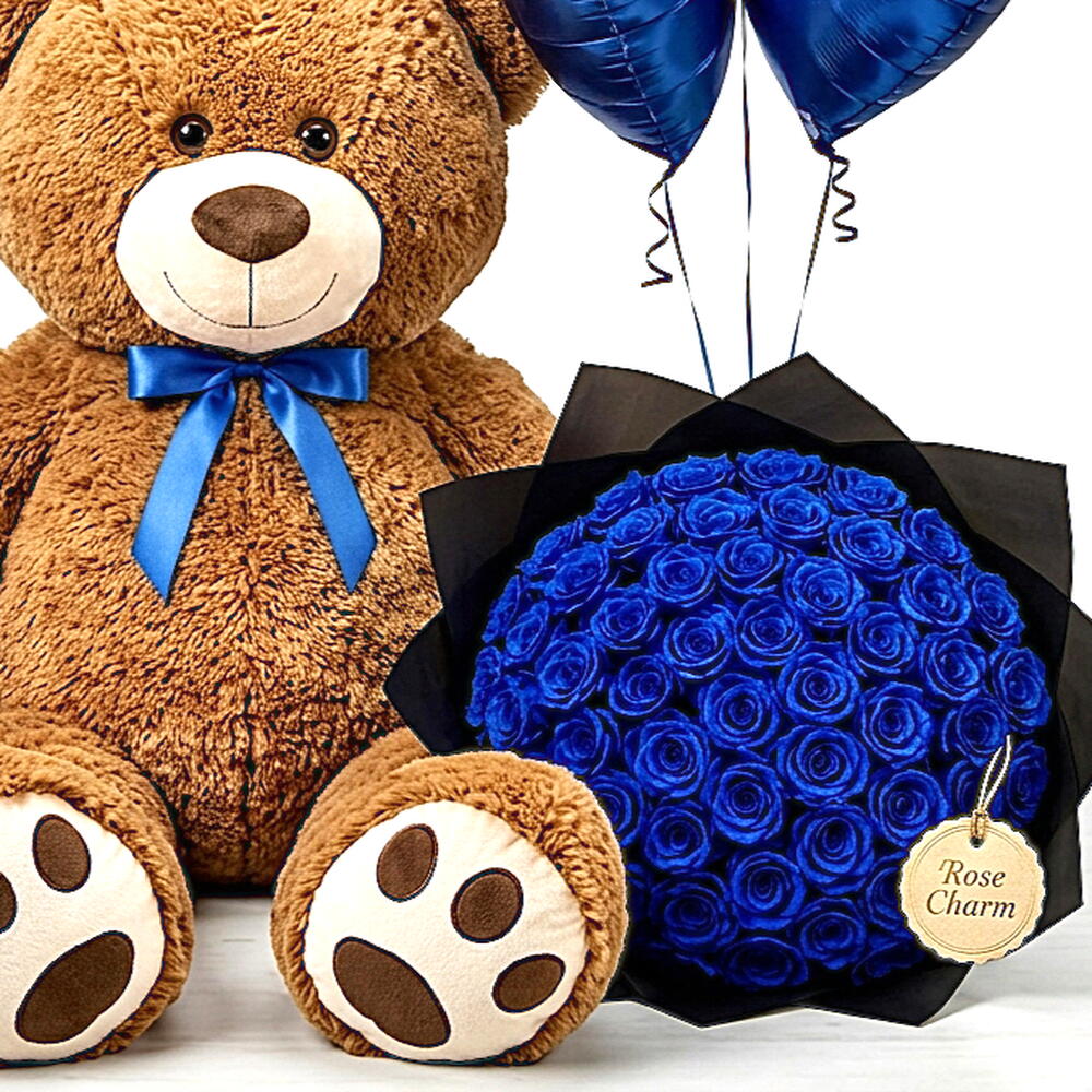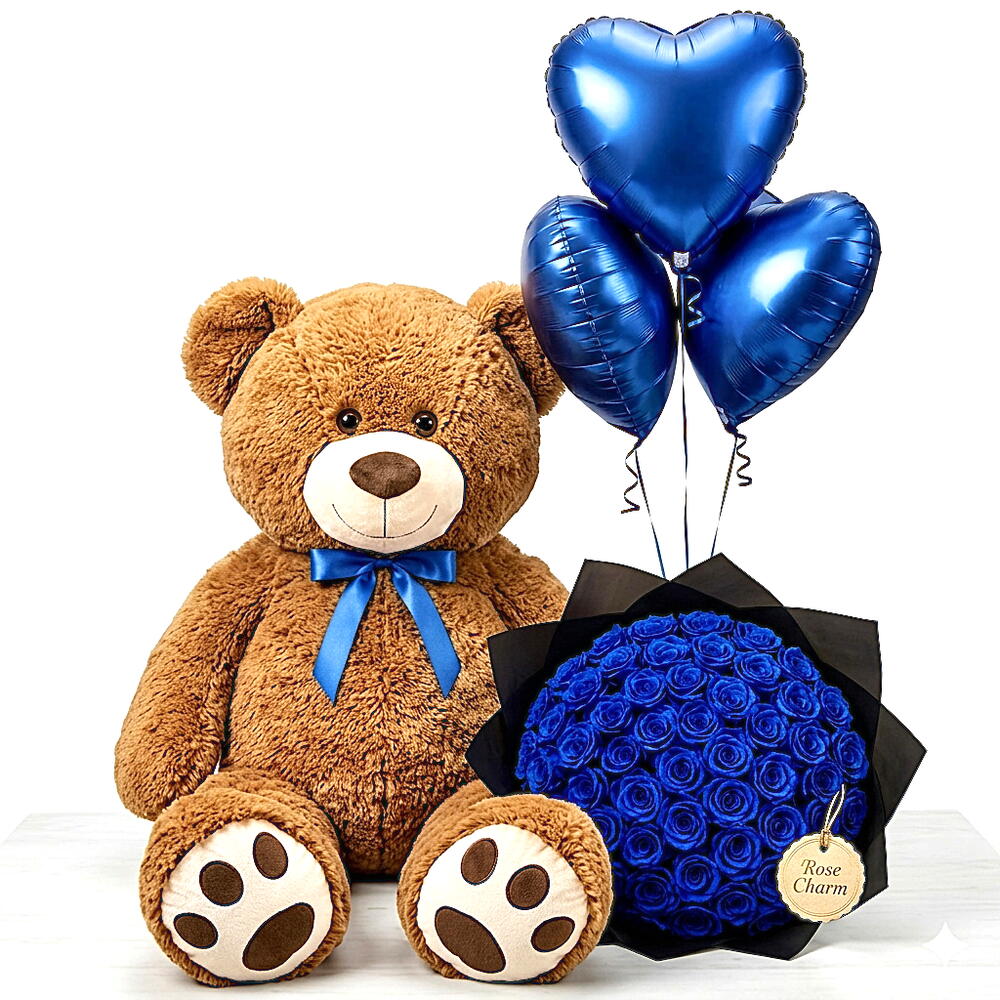 Go big or go home, this show-stopping gift set combines a giant 90 cm plush teddy bear, a striking bouquet of 41 deep blue roses, and 3 metallic heart balloons into one unforgettable delivery. Blue roses symbolise mystery, rarity, and deep admiration, making this the ultimate statement gift for someone truly special. Whats included: Jumbo teddy bear 90 cm tall) · 41 blue roses bouquet · 3 metallic blue heart balloons · Premium gift wrapping · Optional personalised message card Perfect for anniversaries, Valentines Day, birthdays, and grand romantic gestures. Available for same-day and scheduled delivery across Dubai. This is the gift theyll talk about.