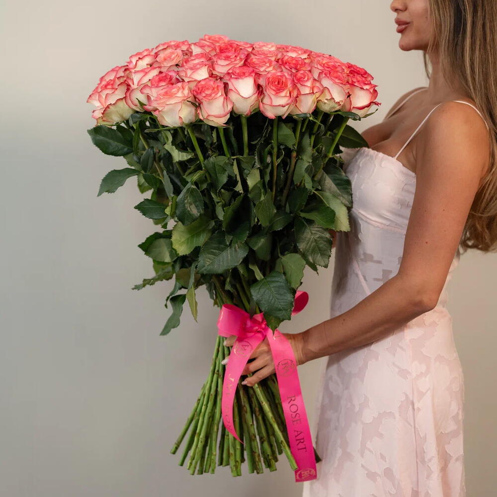 pink and white roses - 51 pcs protective wrapping - 1 pcs hydration pack - 1 pcs branded premium carry bag - 1 pcs personalized message envelope card - 1 pcs branded rose art ribbon - 1 pcs branded tag - 1 pcs