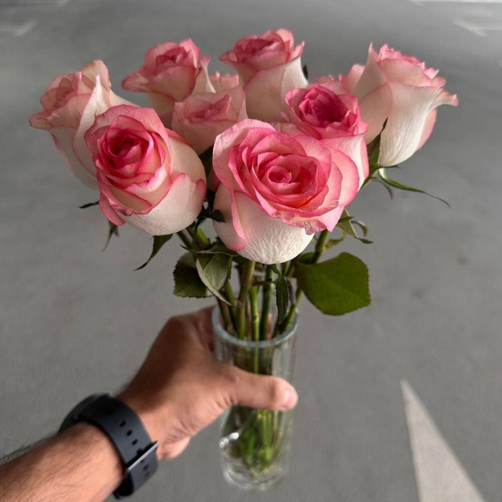 Each rose is handpicked for its freshness and unique dual-tone beauty, while the premium vase adds a sophisticated touch—making it a perfect ready-to-display floral gift. The combination of delicate blooms and a stylish vase creates a timeless centerpiece for any space. Details: 12 fresh Jumilia pink double colour roses Premium quality glass vase Elegant hand-arranged design Ready-to-display arrangement Perfect For: Anniversaries, birthdays, romantic surprises, congratulations, or luxury home décor 🌸
