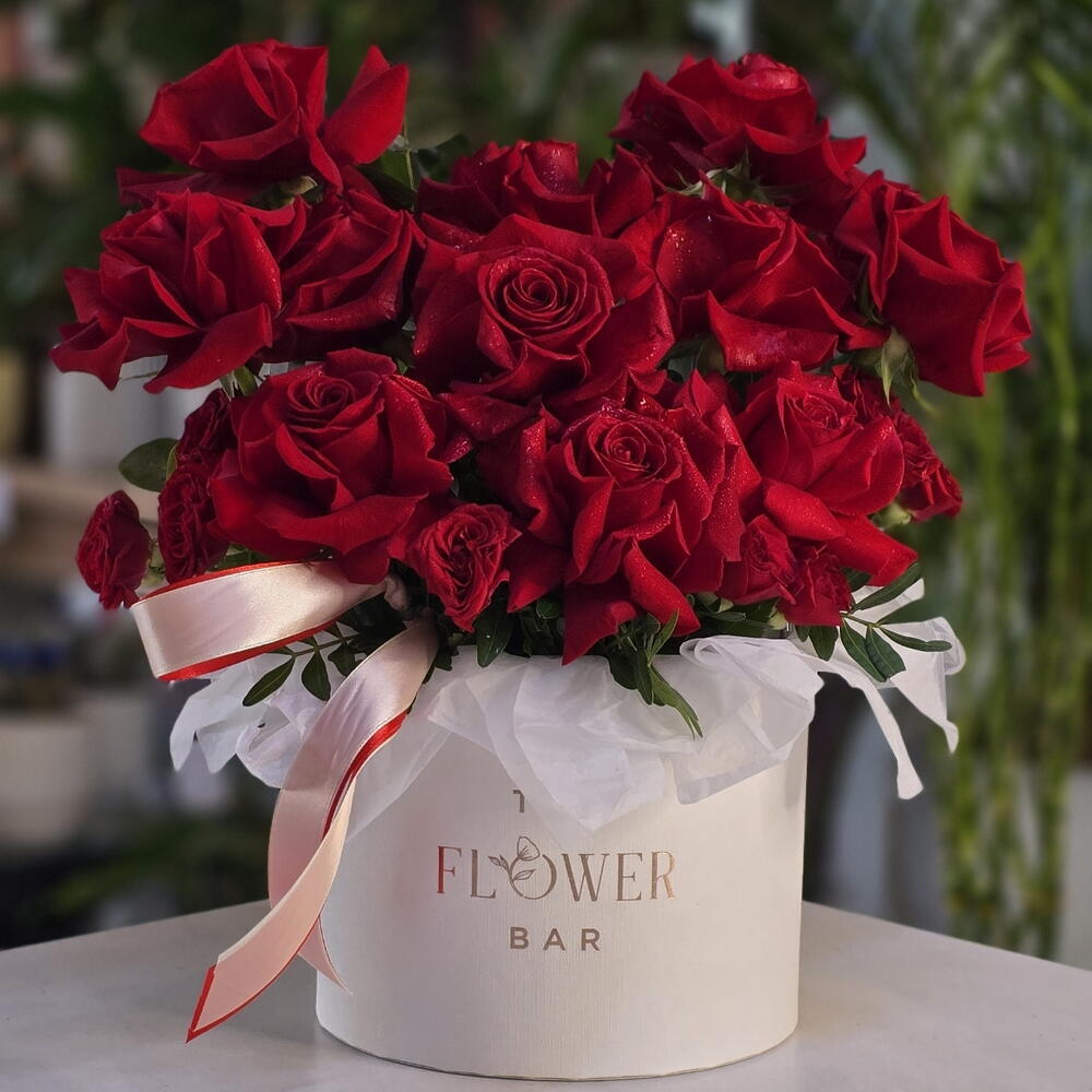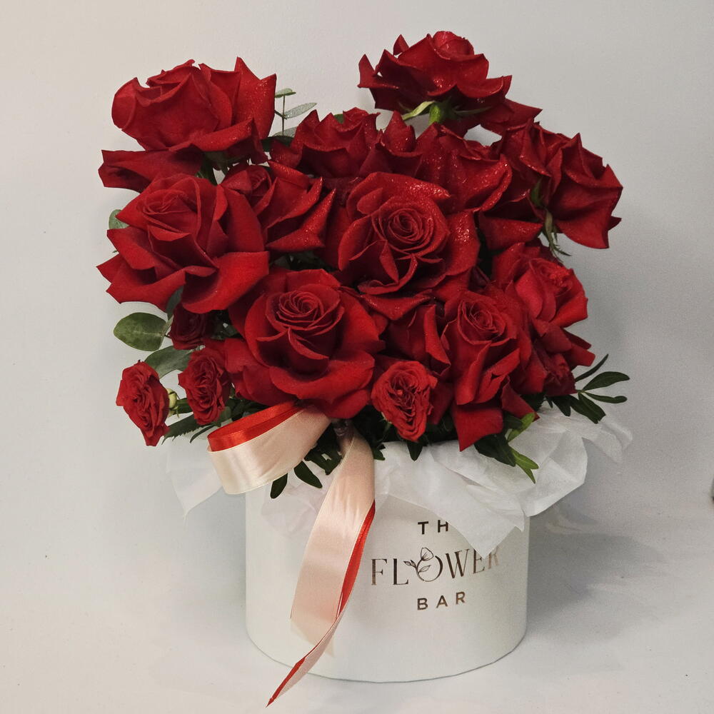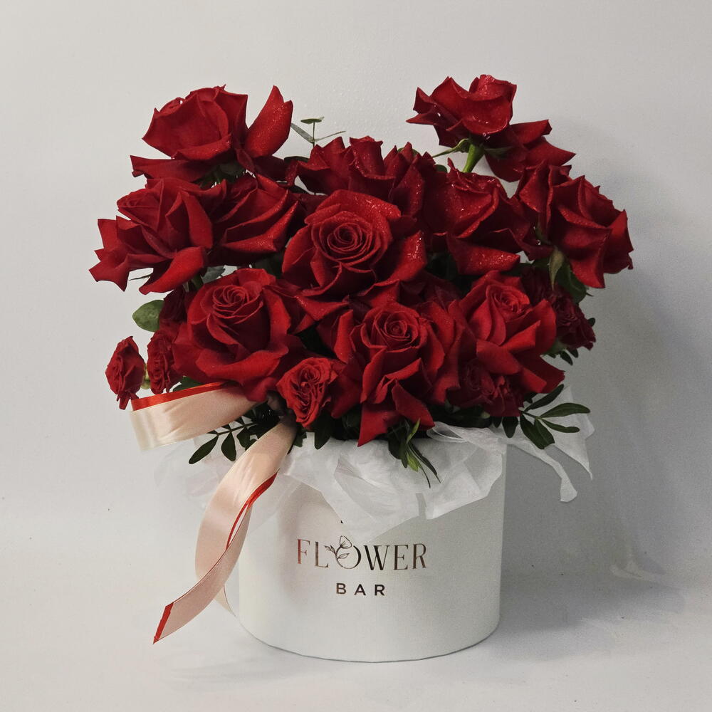 Hatbox - 1 pcs red spray rose - 2 pcs equador red roses - 11 pcs