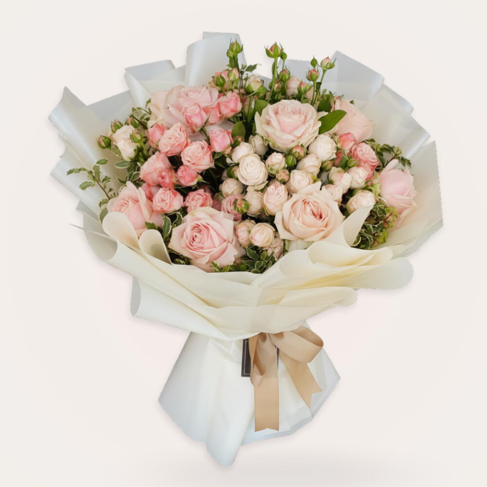 6 stem sweet pink rose, 4 stem reflection baby rose , 4 stem peach baby rose
