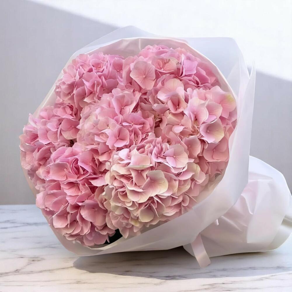 The Kabsv Bouquet is a luxurious and voluminous arrangement of 10 soft pink hydrangeas, perfectly wrapped in six layers of crisp white designer packaging and tied with two delicate pink satin ribbons. With a diameter and height of 60 cm, this lush bouquet captures gentle femininity and romantic charm. Ideal for birthdays, anniversaries, declarations of love, or simply brightening someone’s day, this bouquet is an elegant expression of thoughtfulness and beauty. Care Instructions: Hydrangeas require abundant hydration. Before placing in a vase, cut the stems at an angle using sharp scissors or a knife and immerse them in cold water immediately. Mist the flowers regularly to keep the blooms fresh. Change the water daily and re-trim the stems to ensure optimal absorption. Avoid placing them near heat sources, direct sunlight, or drafts. A cool room will help extend their life and keep the bouquet vibrant.