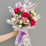This vibrant bouquet is a joyful celebration of color and elegance, perfect for brightening any moment. Lush roses, delicate carnations, and graceful lisianthus blend harmoniously, creating a composition full of romance and charm. Soft pastel tones meet vivid hot pink accents, giving the arrangement a lively and modern feel. The airy polka-dot wrapping adds a playful touch, making the bouquet look fresh, stylish, and memorable. To keep your flowers fresh longer, place them in clean water immediately after receiving, trim the stems by 1–2 cm every two days, and avoid direct sunlight or drafts. This bouquet is a gorgeous choice for birthdays, celebrations, or simply to make someone smile.
