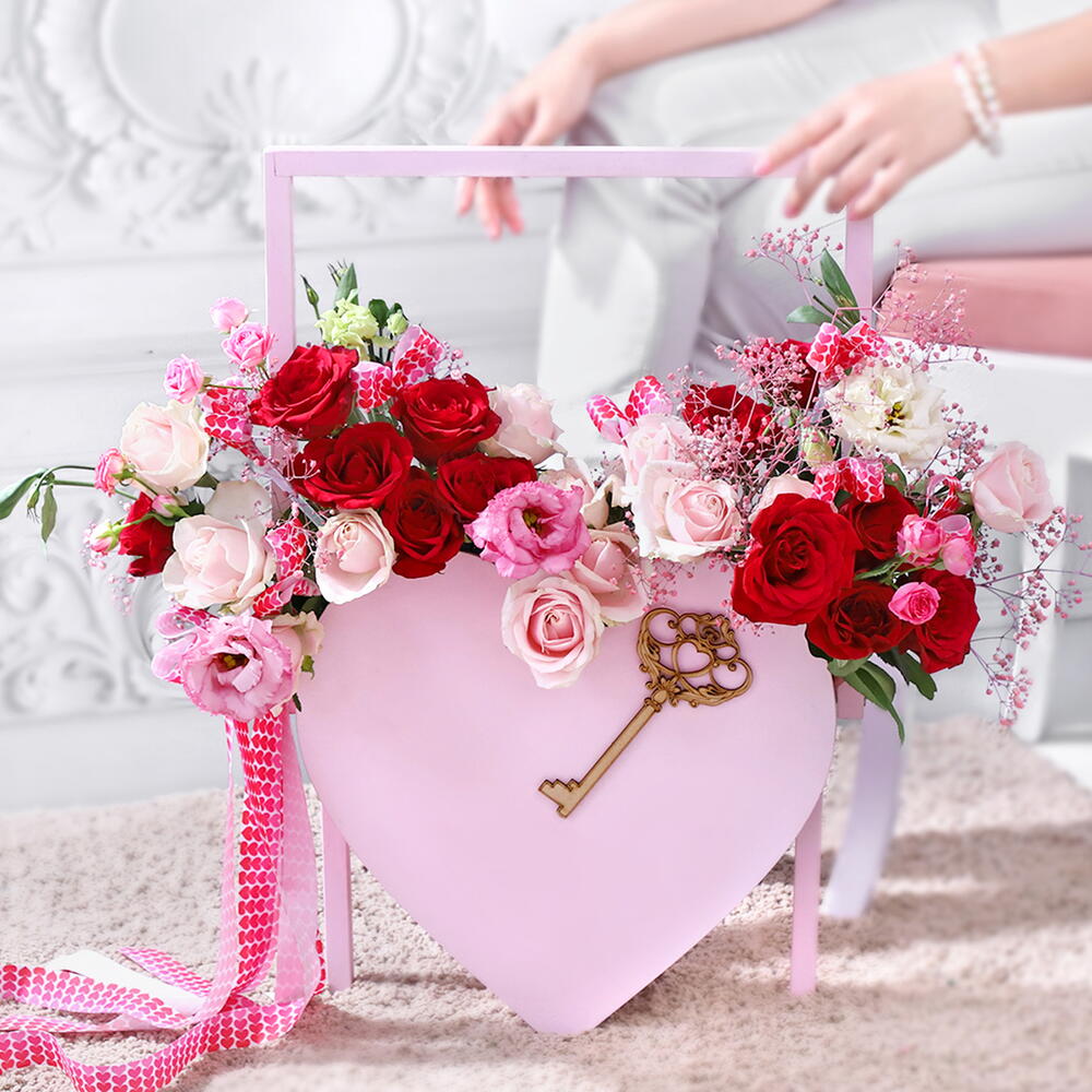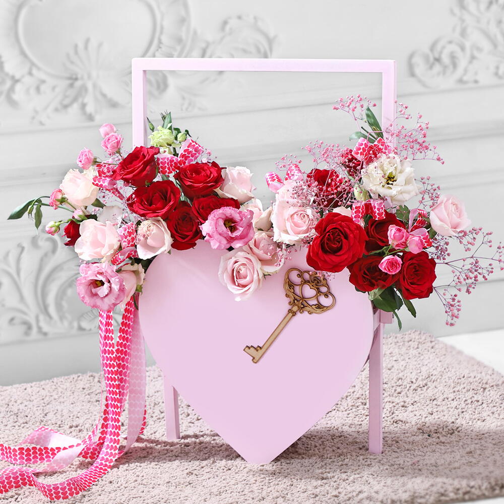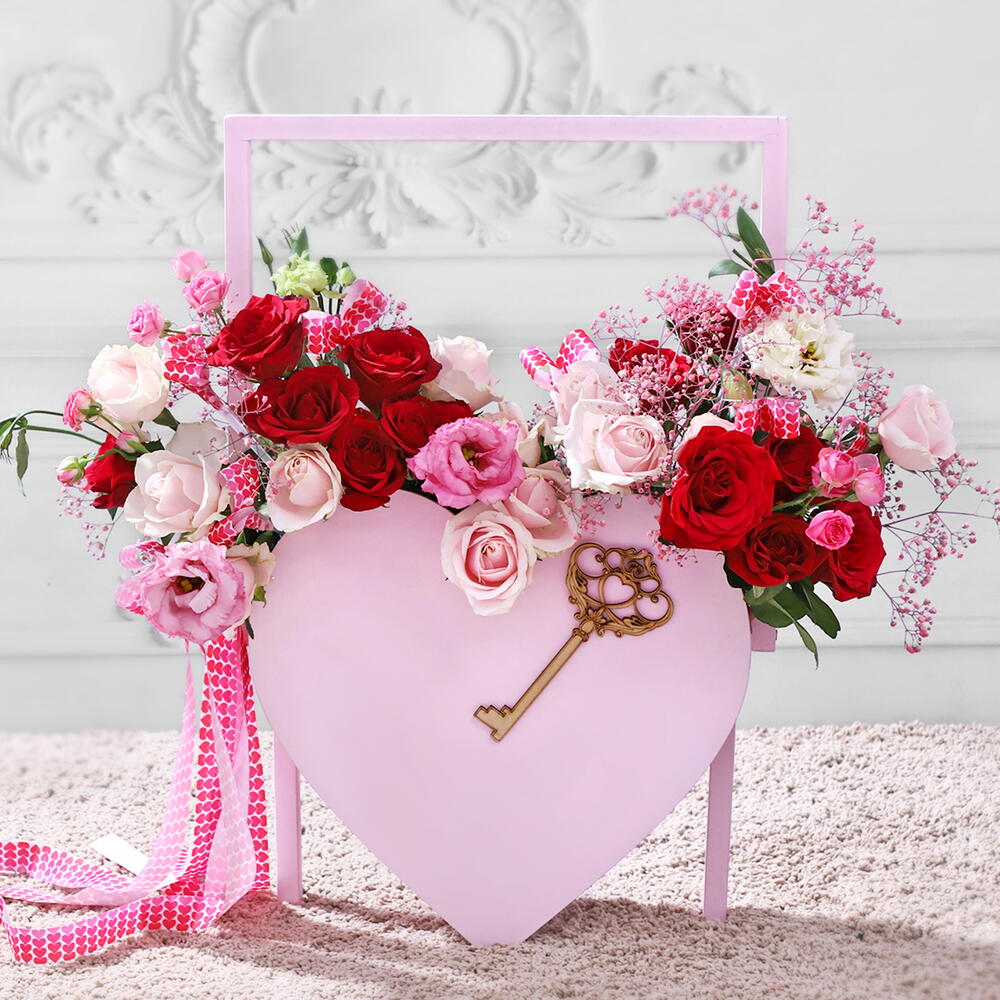 A heart-shaped basket adorned with a key motif, it\s locked away with sweet whispers of forever love. And a resounding emotion that fills your heart with joy - Red roses, sweet avalanche roses, spray roses, lisianthus and pink gypso.