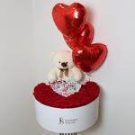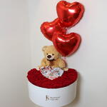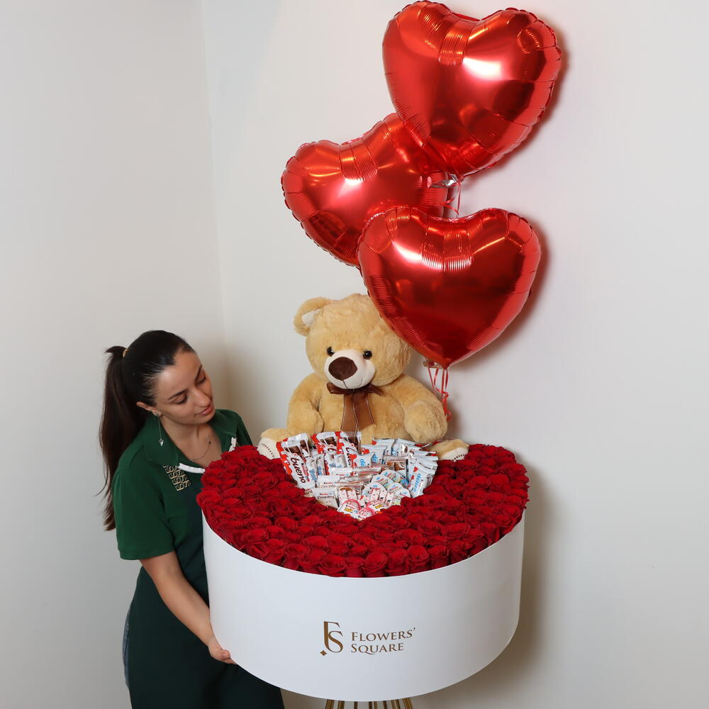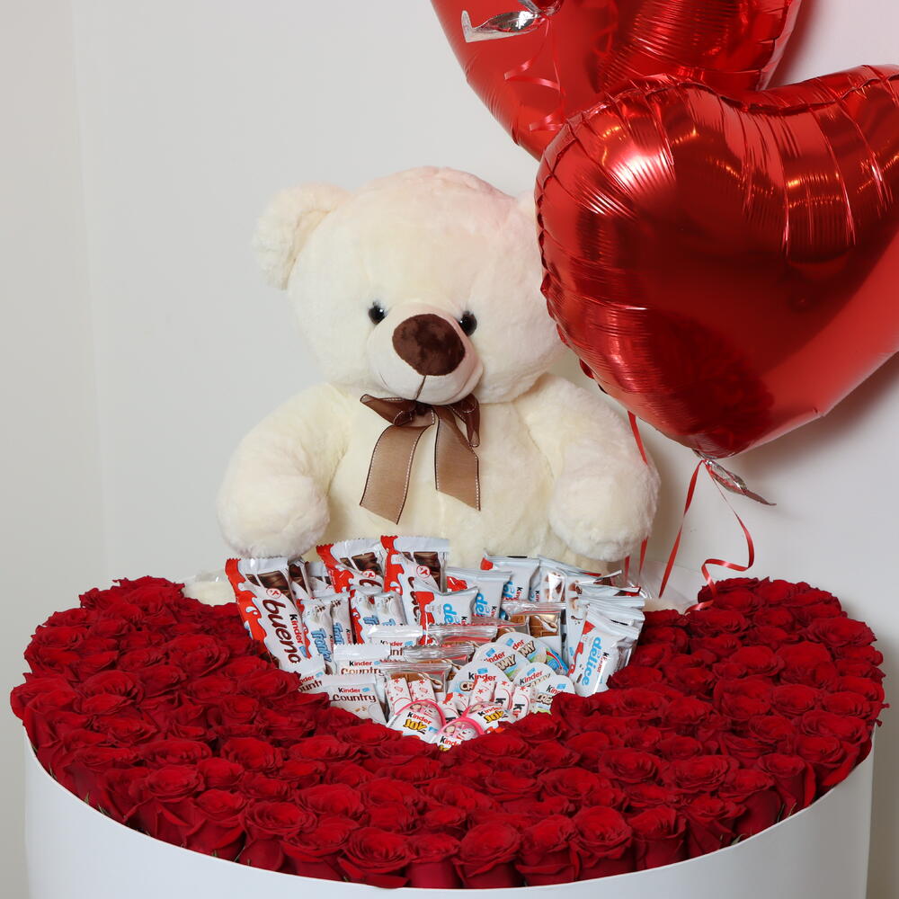 Experience the joy and sweetness of our Kinder Surprise Flower Box. This beautifully curated box includes a cuddly teddy bear, delicious kinder chocolates, romantic red roses and heart balloons. Perfect for expressing your love and spreading happiness.