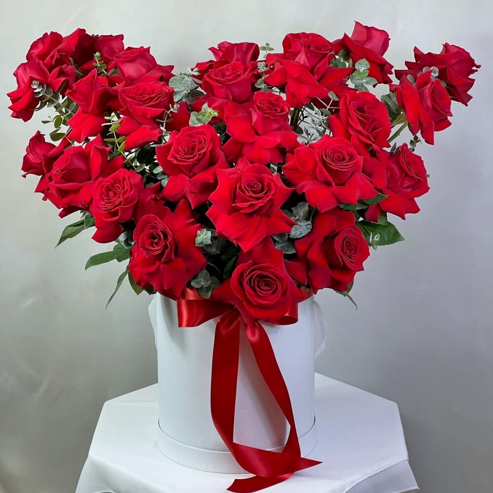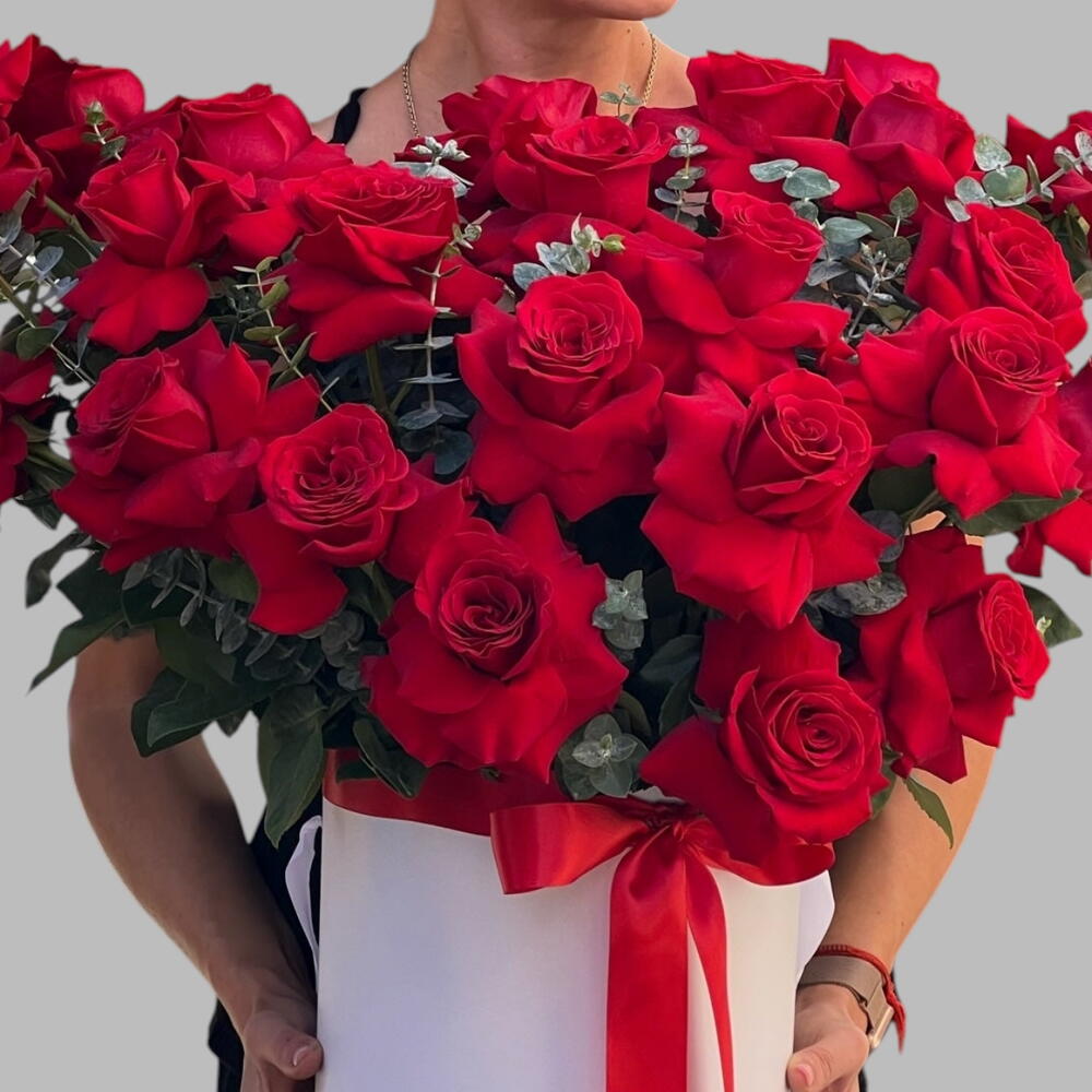 a meticulously crafted circular hat box, tastefully adorned with fragrant eucalyptus and an array of 69 stunning roses. This masterpiece of floral artistry is designed to elevate any special occasion, whether its the romantic allure of Valentines Day, the cherished milestones of an Anniversary, or simply a heartfelt expression of appreciation.