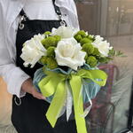 Composition: Rose white - 7, Chrysanthemum spray - 4, Pistacia - 2, Velvet pouch bag - 1 Sizes: WIDTH - 20CM; HEIGHT - 25CM; LENGTH - 25CM; (including packaging) Size: 20 x 25 x 25 cm