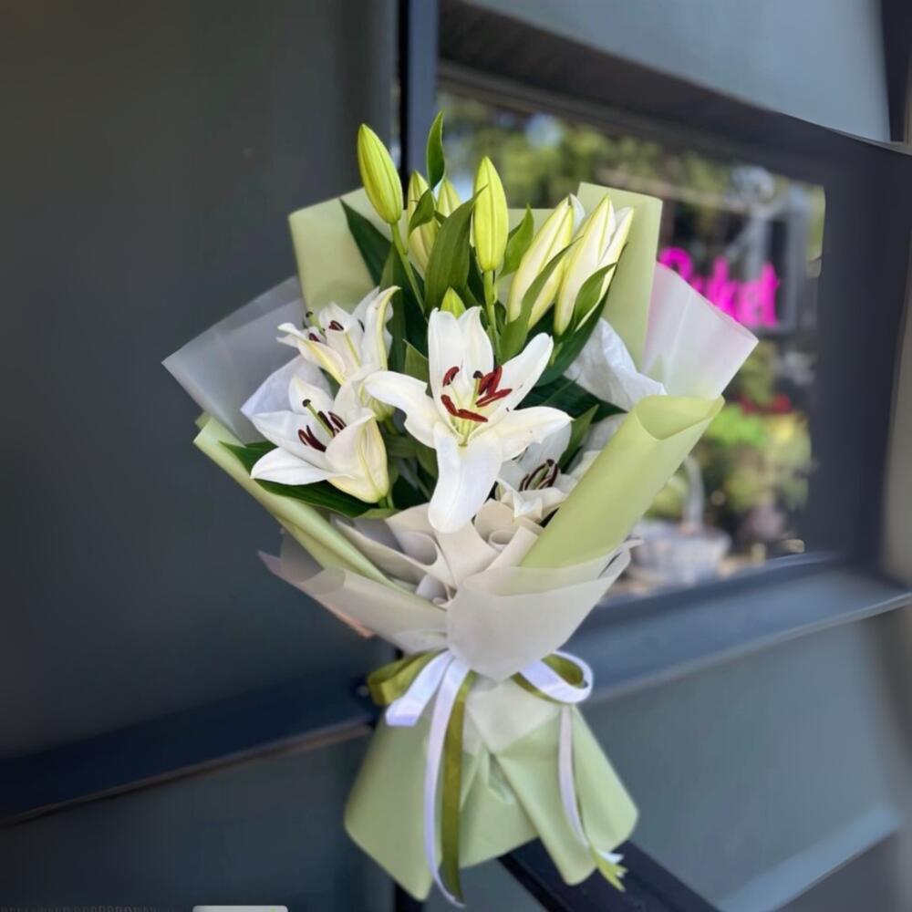 A graceful bouquet of 5 elegant white lilies, symbolizing purity, renewal, and fresh beginnings. Perfect for weddings, anniversaries, or as a heartfelt gift to brighten any special occasion