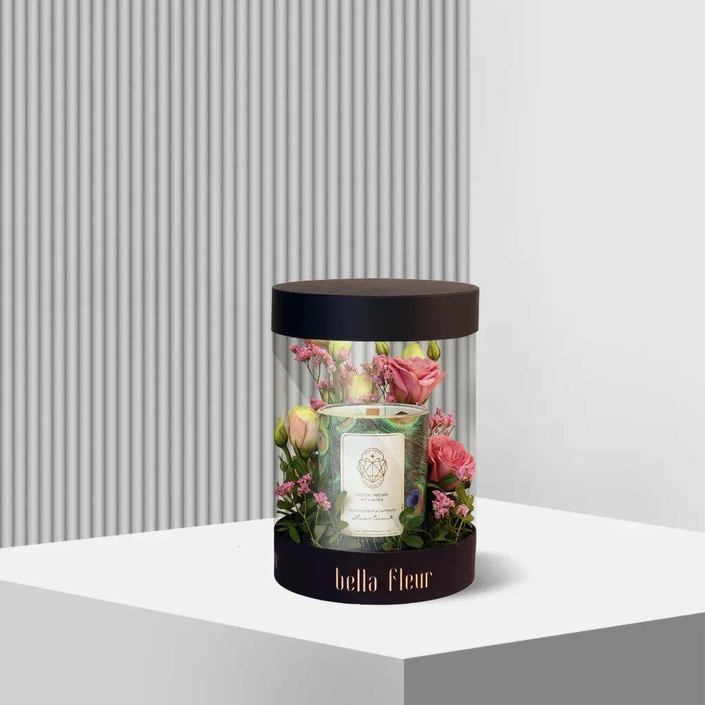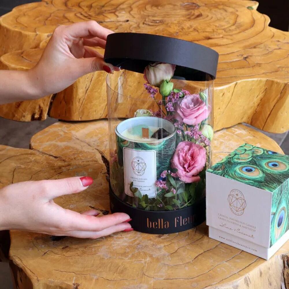 Limonium - 1 pcs lime and coconut candle (peacock) - 1 pcs small bella box - 1 pcs 1 lisianthus - 1 pcs