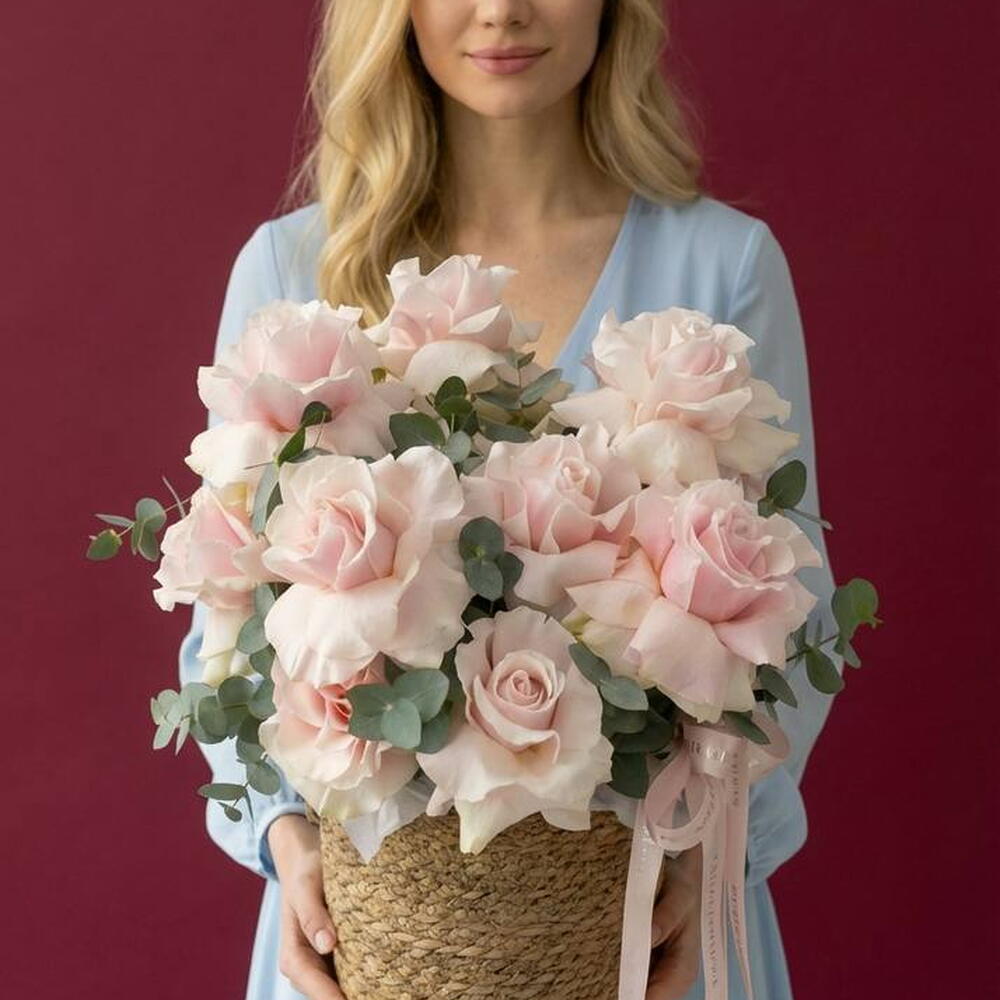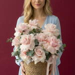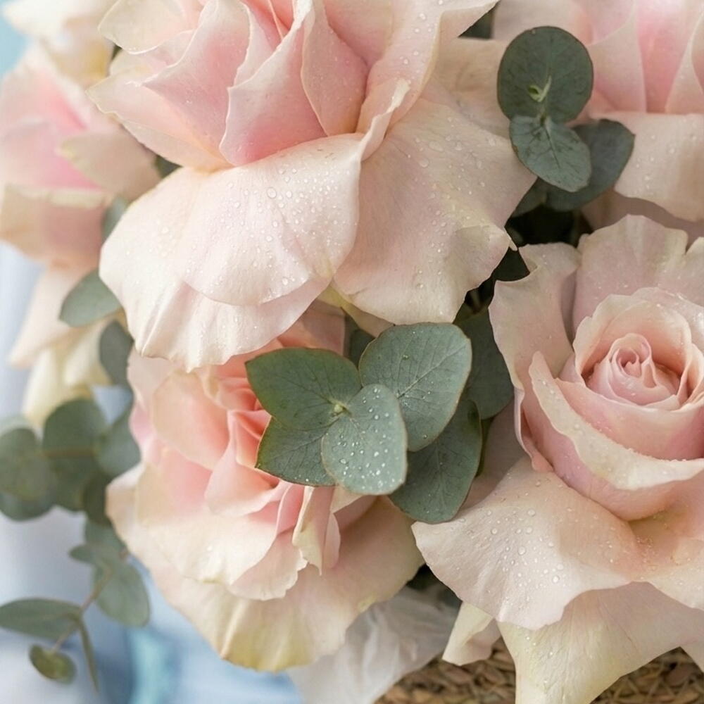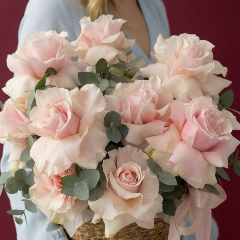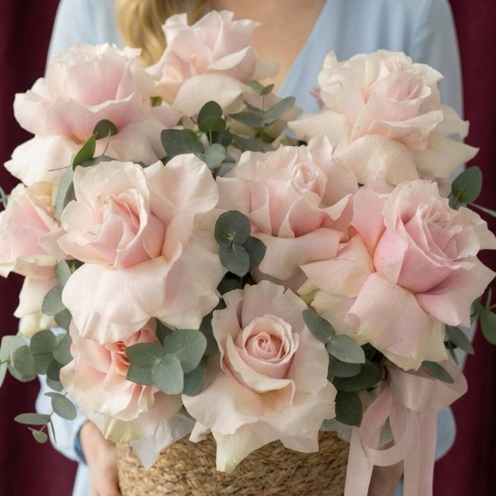 The charming and exquisite composite bouquet includes 15 delicate French Rose roses and 5 eucalyptus leaves that vibrate with a dizzying fragrance. This composition seems to transport you into the mysterious and romantic world of French boulevards, remaining an ideal gift for loved ones. Bring aesthetics and sophistication to life by presenting this flower basket as a special greeting, admiration or gratitude.