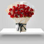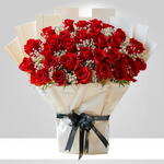 The flowers are arranged in a large, round bouquet and wrapped in a light-colored paper, possibly white or cream. The bouquet is tied with a wide, black ribbon. Red roses are a classic symbol of love and passion, making this type of bouquet a popular choice for romantic occasions such as anniversaries and Valentines Day.