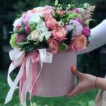 Composition: Peony white - 3, Lisianthus - 3, Freesia - 5, Astilbe - 1, Hypericum - 2, Spray Rose Julieta peach - 2, Heleborus - 2, Rose Pink Expression - 7, box - 1, ribbon - 2 Sizes: WIDTH - 20CM; HEIGHT - 20CM; LENGTH - 20CM; (including packaging) Size: 20 x 20 x 20 cm