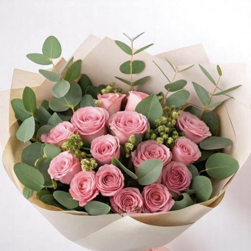 This delicate bouquet of soft pink roses and fresh eucalyptus is a graceful expression of elegance and charm. Ideal for birthdays, thank-you gifts, or simply brightening someone’s day, this arrangement exudes gentle sophistication. The pastel roses radiate warmth and affection, while the eucalyptus adds a modern, refreshing touch. Wrapped in natural-toned paper and tied with a blush pink ribbon, it’s a perfect gesture for any heartfelt moment. Trim stems at a 45-degree angle before placing in water. Keep the bouquet in a cool place away from direct sunlight and heat. Change the water every 2 days and remove any fading petals or leaves for longer freshness.