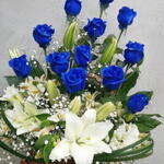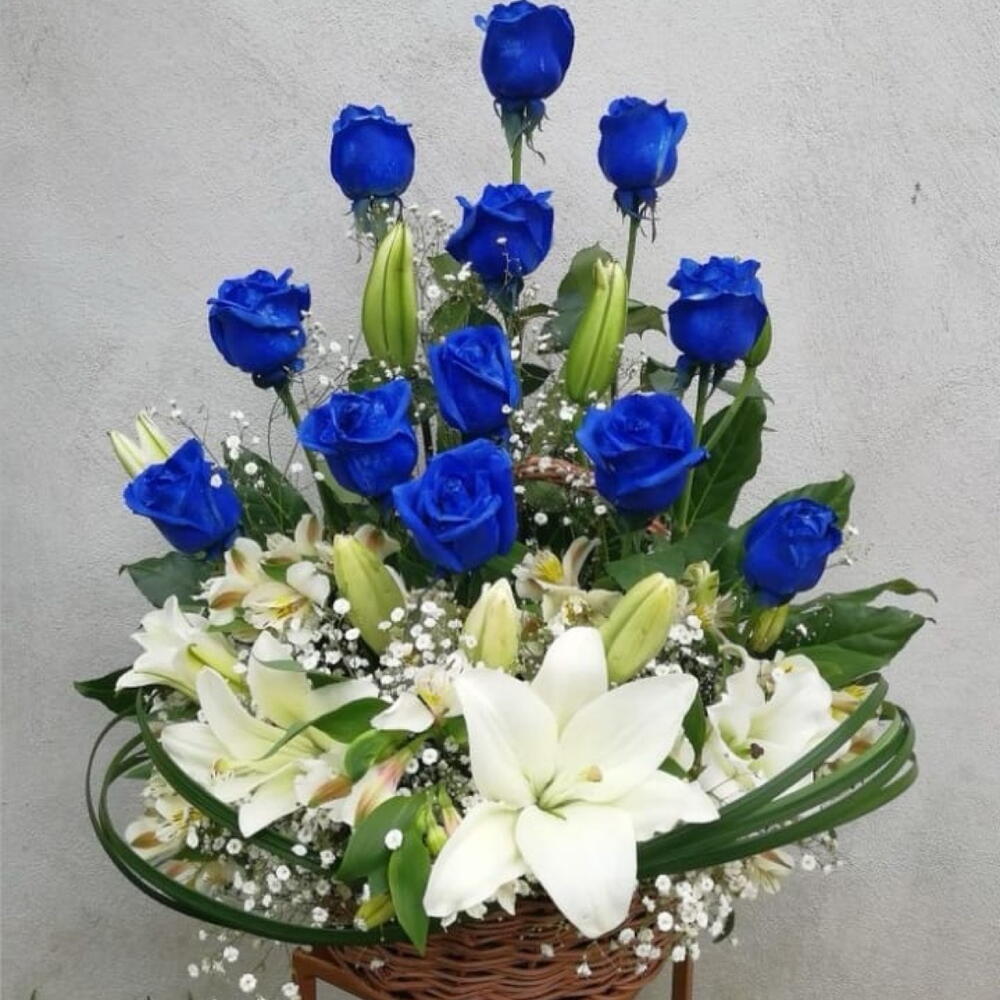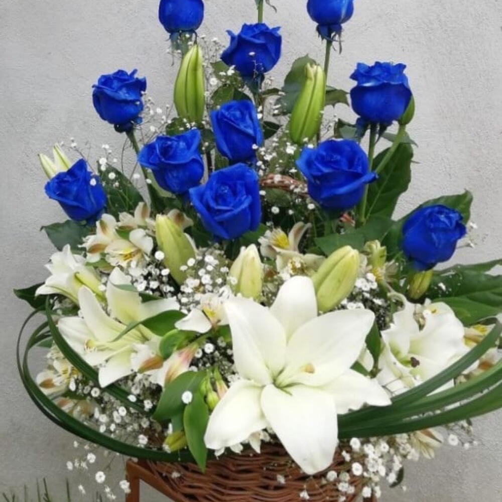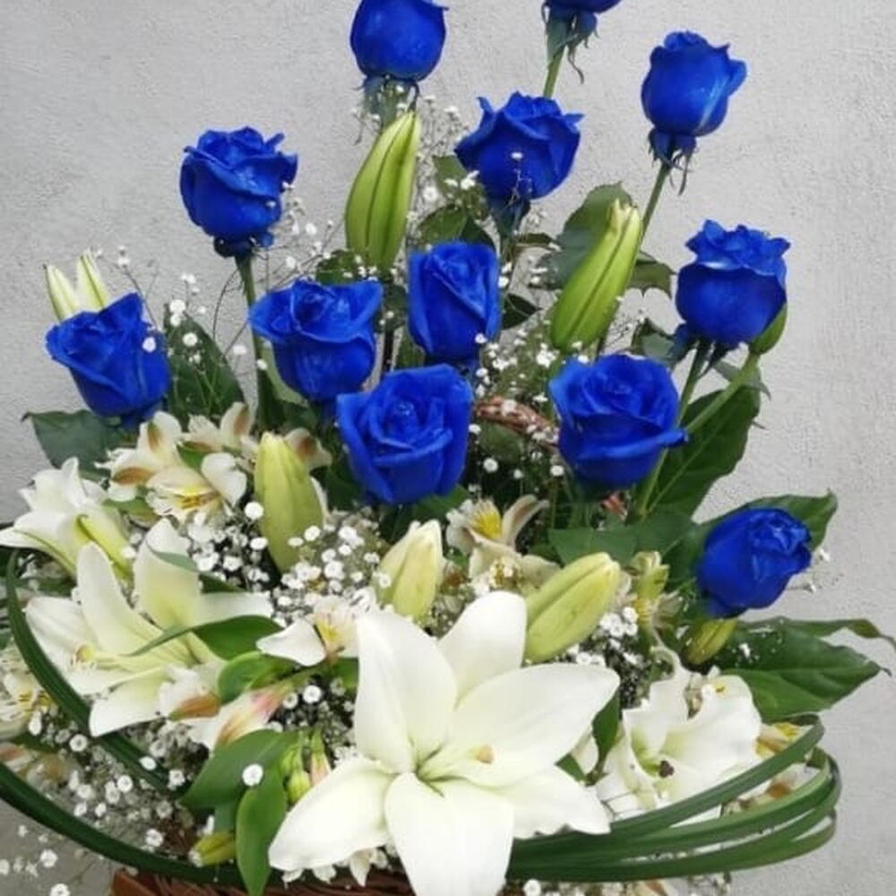Basket - 1 pcs Gypsophila - 4 pcs white alstroemeria - 4 pcs white lilly - 4 pcs blue rose spray color - 12 pcs still grass - 8 pcs russcuss leaves - 6 pcs