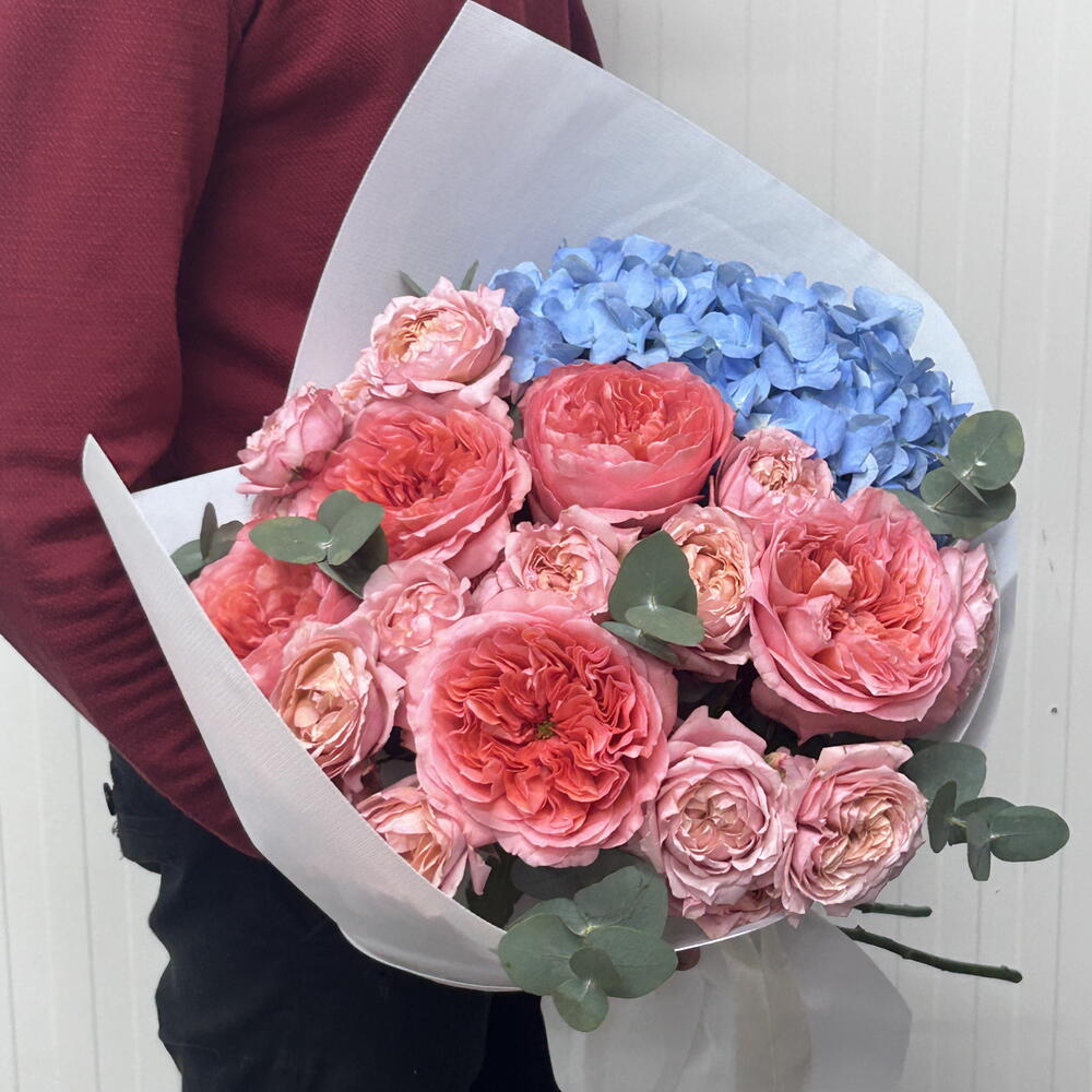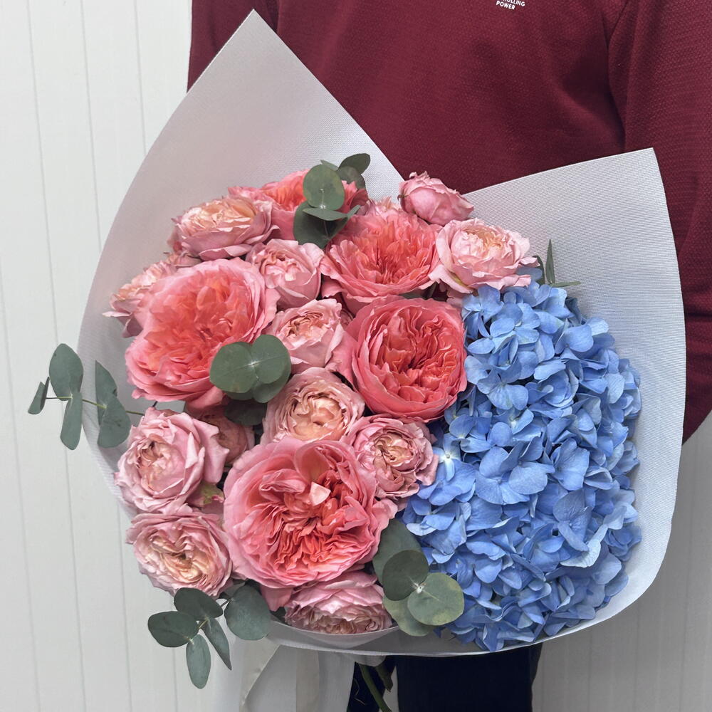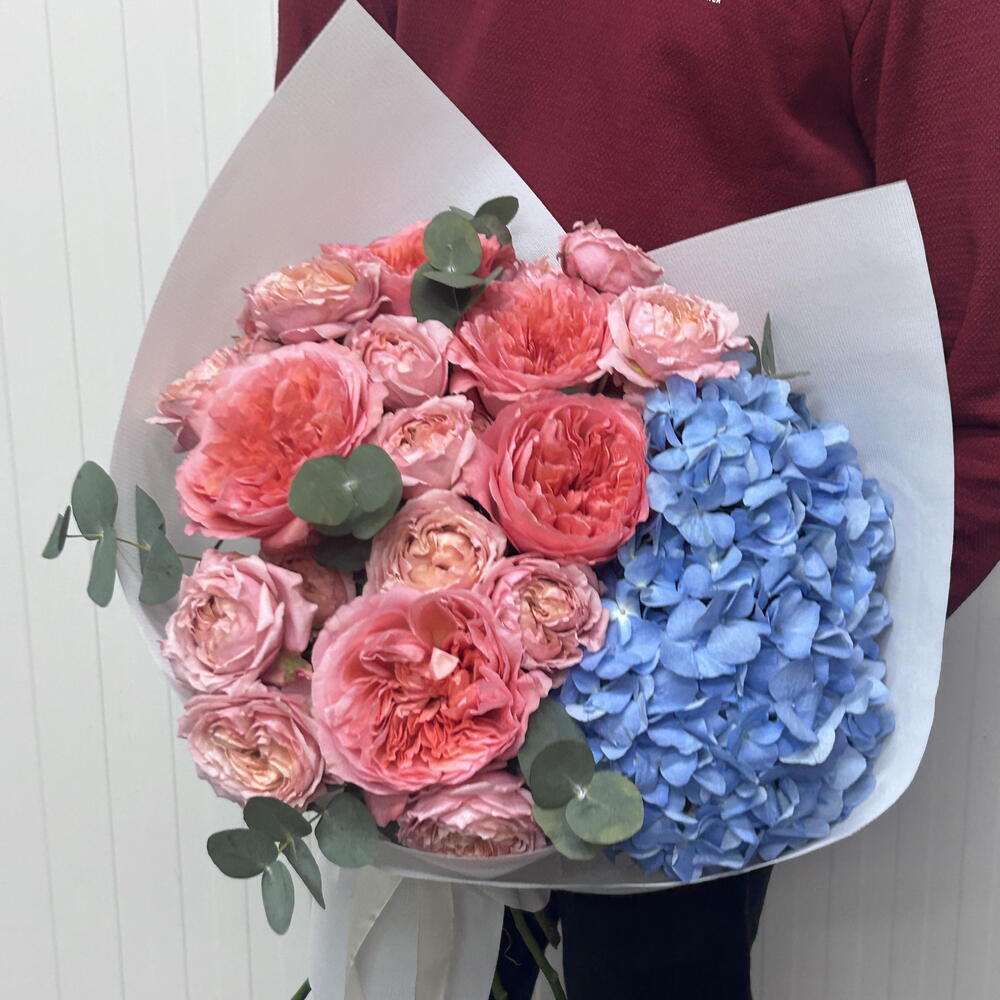 hydrangea blue - 1 pcs wrapping paper - 4 pcs pink expression - 5 pcs eulcyptus - 4 pcs julietta peach - 5 pcs