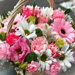 Basket - 1 pcs Chrysanthemum white - 3 pcs pink Gerbera - 2 pcs alstroemeria white - 3 pcs pink lisianthus - 2 pcs bombastic spray rose - 3 pcs pink carnations spray - 5 pcs