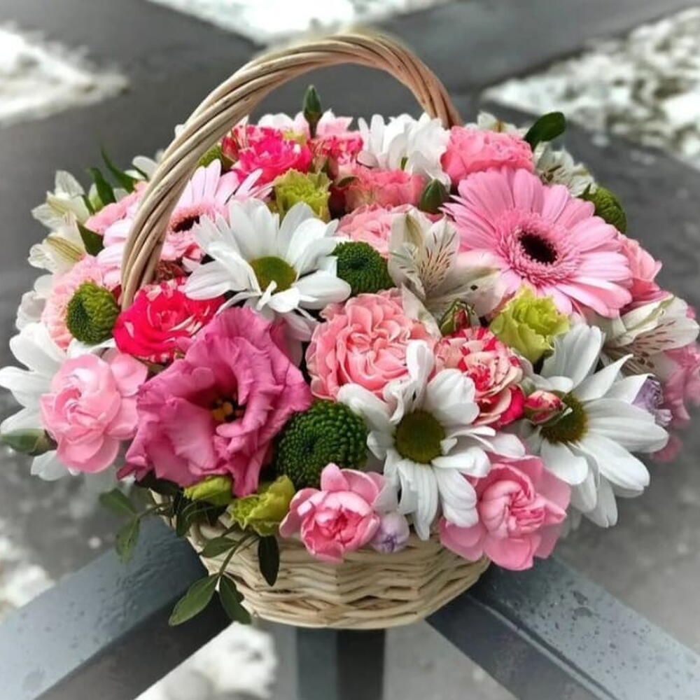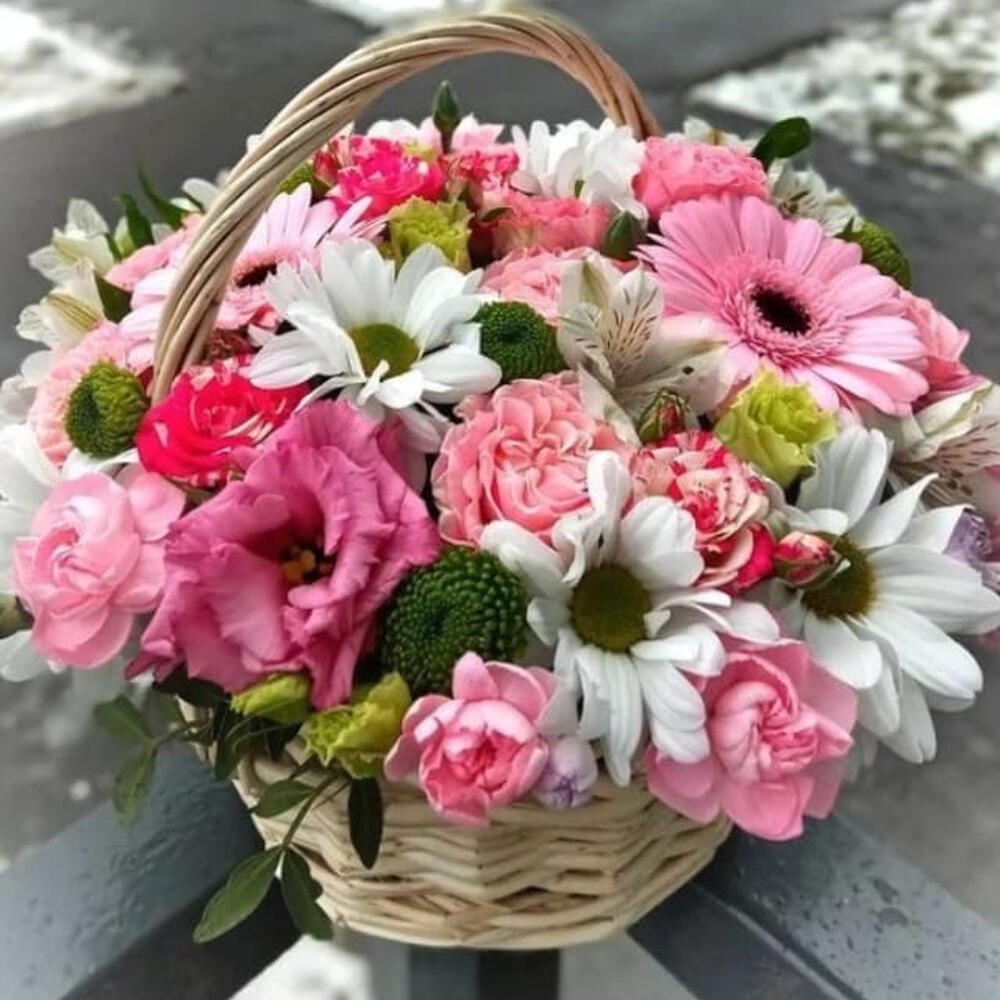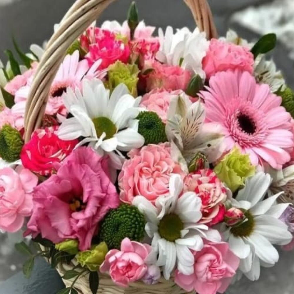 Basket - 1 pcs Chrysanthemum white - 3 pcs pink Gerbera - 2 pcs alstroemeria white - 3 pcs pink lisianthus - 2 pcs bombastic spray rose - 3 pcs pink carnations spray - 5 pcs