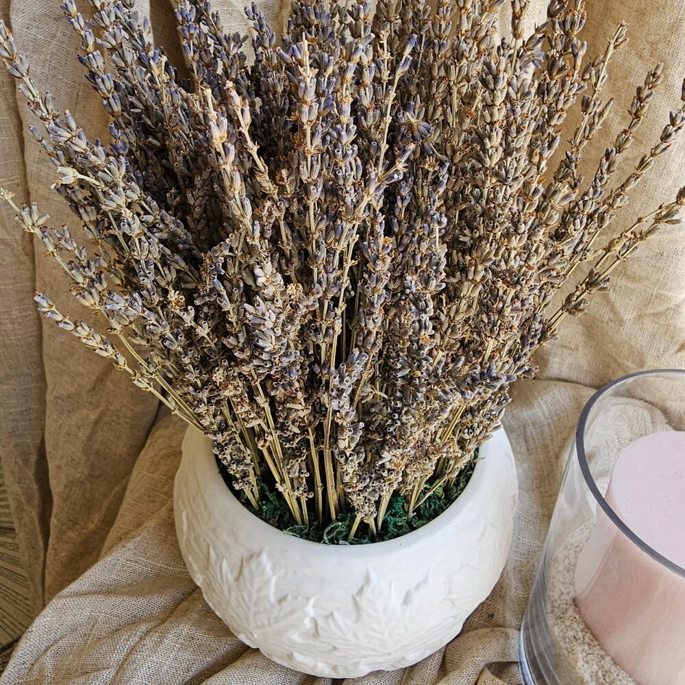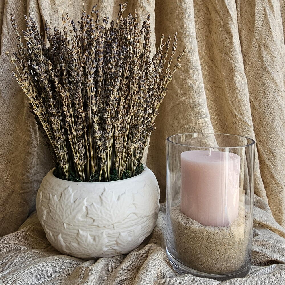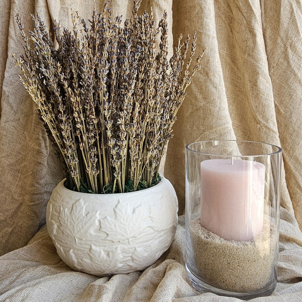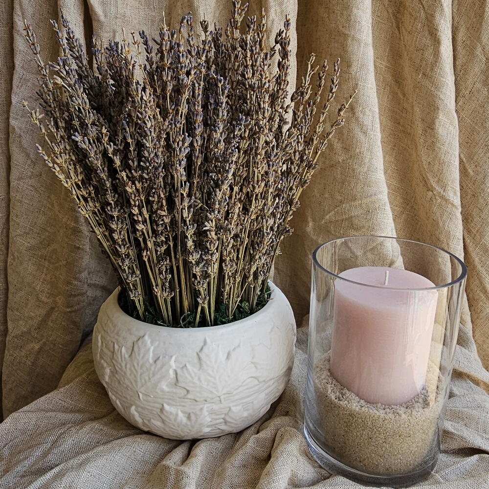 Immerse yourself in the tranquility of nature with this set of 150 exquisite dried lavender stems, beautifully packaged with an accompanying pink scented pillar candle. The bundle also includes a chic white ceramic vase that brings elegance to any room, and a versatile glass cylinder for added aesthetic appeal. Ideal for adding a touch of charm and fragrance to your space, or as a thoughtful gift for a loved one who appreciates the subtle beauty of natural décor.