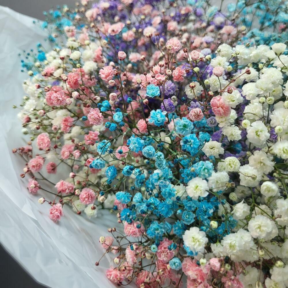 A large, delicate and fluffy bouquet of colourful gypsophila.