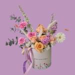 Delight in the charm of our elegant arrangments, carefully arranged in a bespoke hat box. This unique arrangement features 5 lush peach roses, perfectly complemented by the unmatched elegance of 3 lilac mattiolas. The bouquet gets its twinklings of freshness from 3 white chrysanthemums and pops of color from 3 vibrant pink gerberas. Adding a touch of timeless grace are 3 dried white pampas, coupled with the delicate allure of 2 white delphiniums. Each flower is handpicked, designed to create an aesthetic visual and emotional impact. Perfect for gifting or adding a splash of color to your home decor.