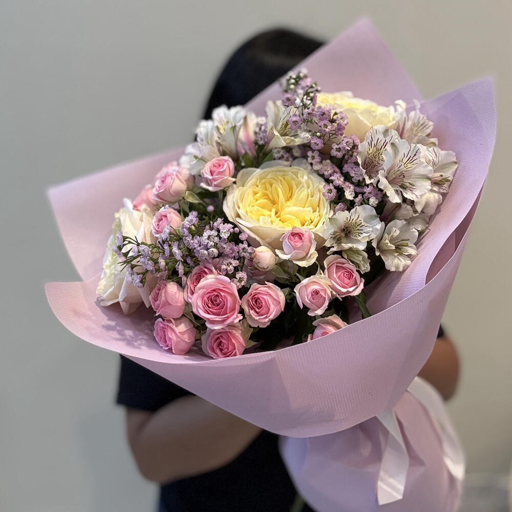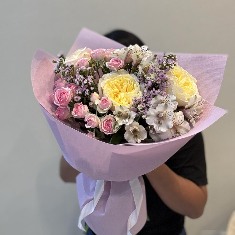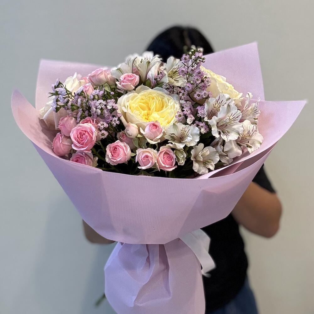 dinara - 3 pcs wax purple - 2 pcs fatima garden rose - 3 pcs alstromeria white - 3 pcs