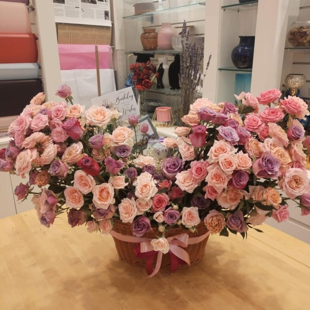 A luxurious gift basket overflowing with romance and warmth, this floral composition is more than just a bouquet—its an experience. A lush arrangement of spray roses and garden roses in soft pink, peach, lavender, and blush tones surrounds a charming selection of thoughtful extras. Nestled inside are fragrant dried lavender, a gourmet chocolate bar, a stylish candle, and an elegantly wrapped envelope for your personal message. Presented in a woven pink basket and finished with a satin ribbon, this gift is ideal for anniversaries, birthdays, or heartfelt thank-you gestures. Its a symphony of beauty, fragrance, and flavor designed to surprise and delight. A gift that speaks from the heart and pampers the senses.